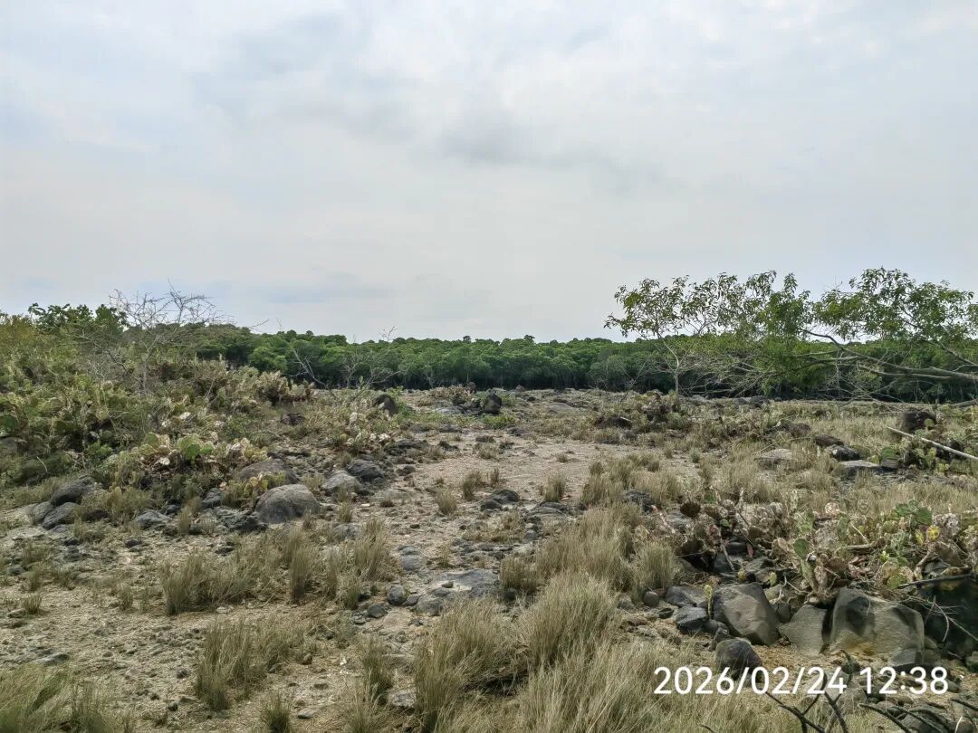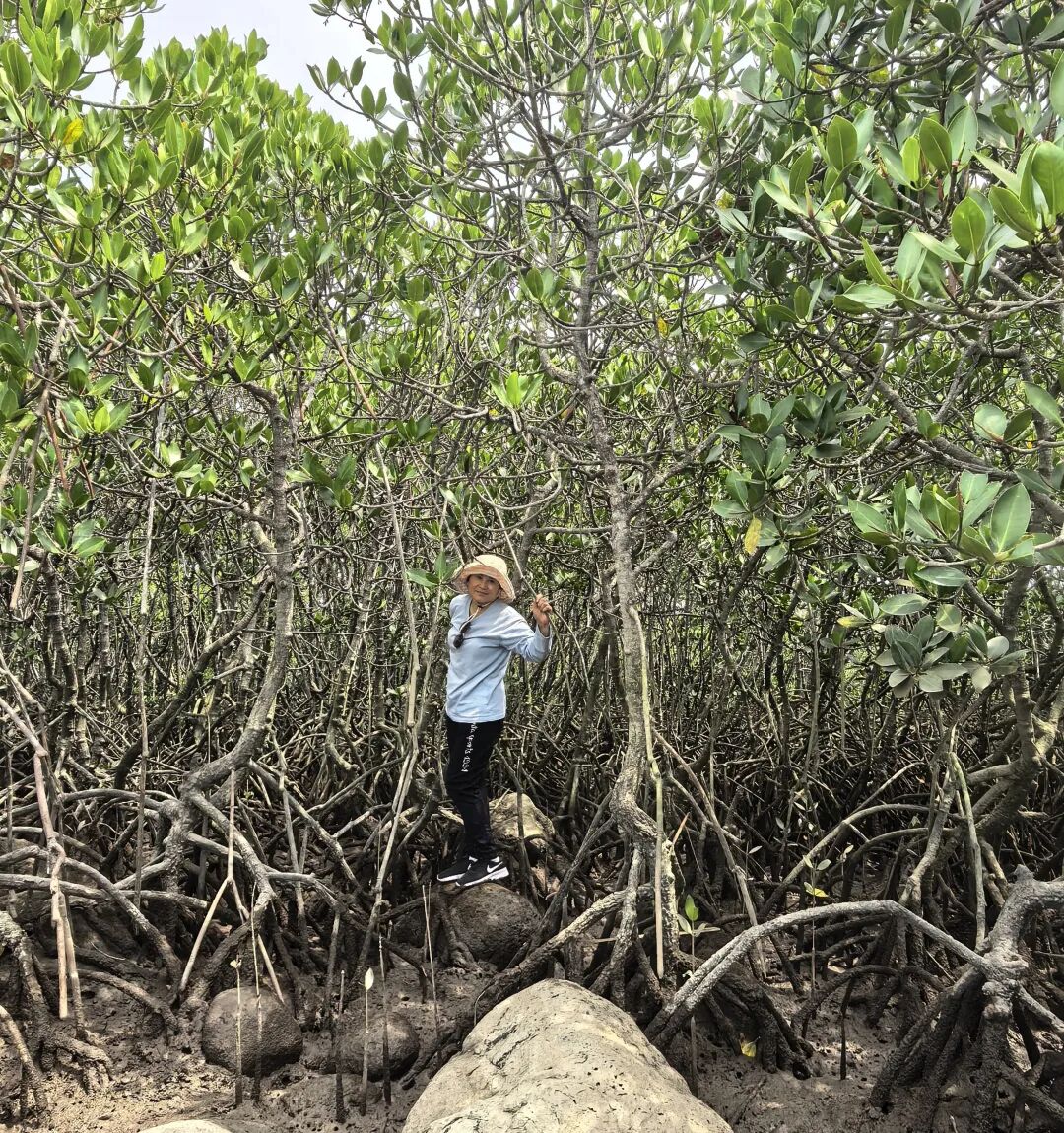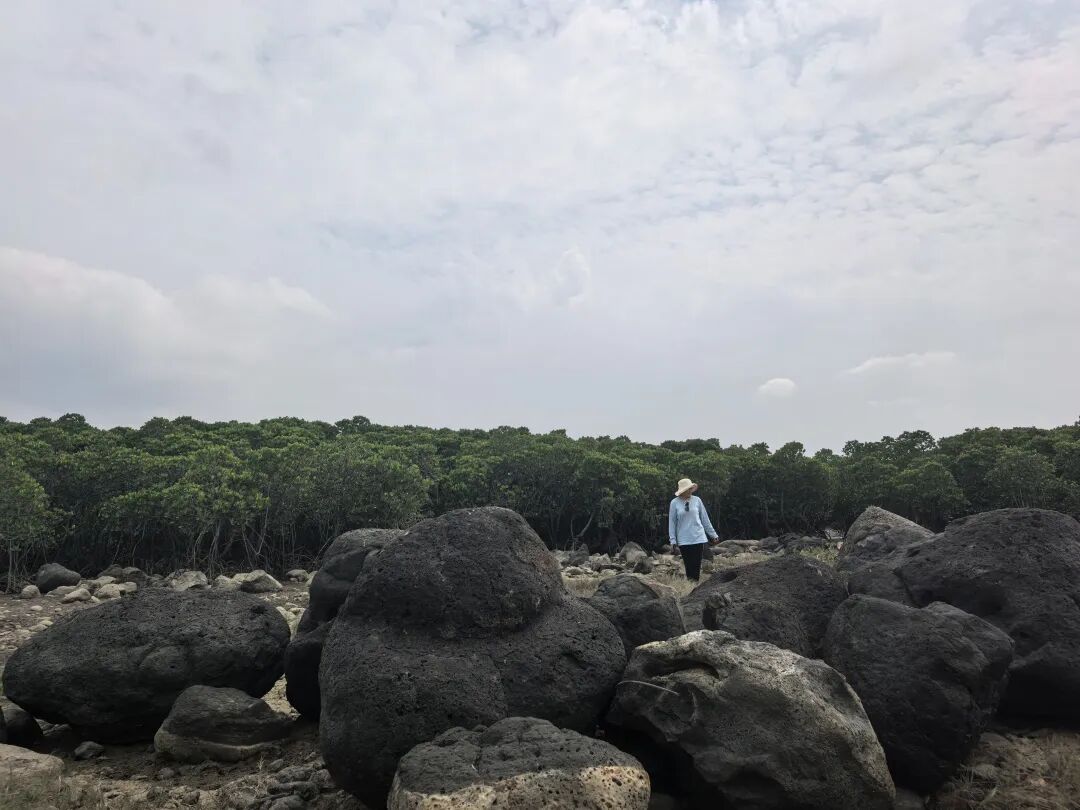 前有野径,下车探秘。 是一片“野渡无人”的火山石滩涂。前方密密匝匝,盘根错节的红树林,很蛮荒,也属于儋州湾湿地公园的一部分吧。