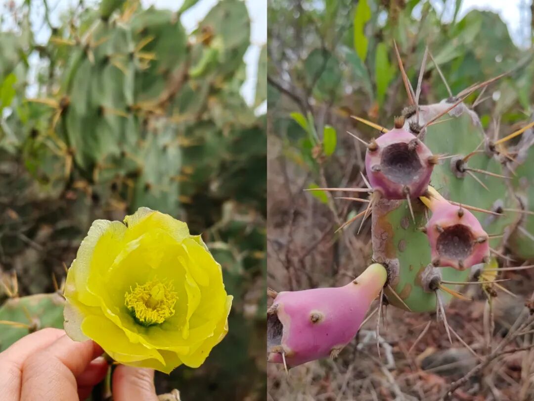 好大一片仙人掌,在无人理睬的滩涂上、火山石狭缝间凌乱疯长。美丽的黄色花,诱人的红色果(年前看到农贸市场有当地人售卖,所以知道了仙人掌果实也有价值),更有望而生畏的锋利的刺。