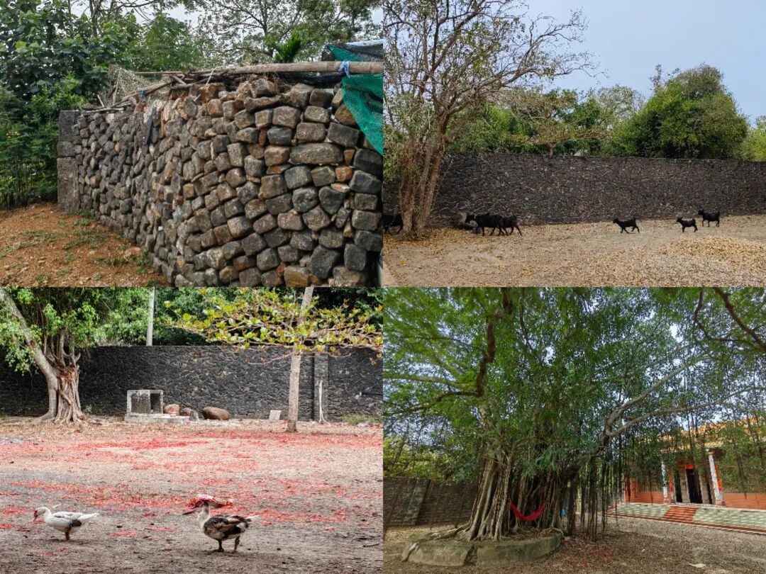 我手机定位,名为桥陋村。看着火山石砌成的院墙,真像个古村落。怀着好奇,我们在一个空旷无人的大院子门口向里面探望,一颗硕大的榕树,几间某姓氏的祠堂,两只悠哉游哉的鸳鸯,院门外走着的羊群,还有一个好奇对着我们驻足的村民……