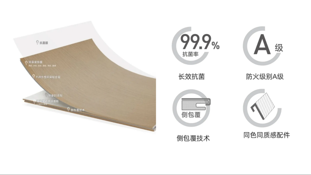 “全屋高端饰面,摒弃传统白墙,实现视觉与品质的双重升级”,以一线品牌抗菌护墙板与岩板背景墙系统,构建出无缝、高级且极具呵护感的室内界面。