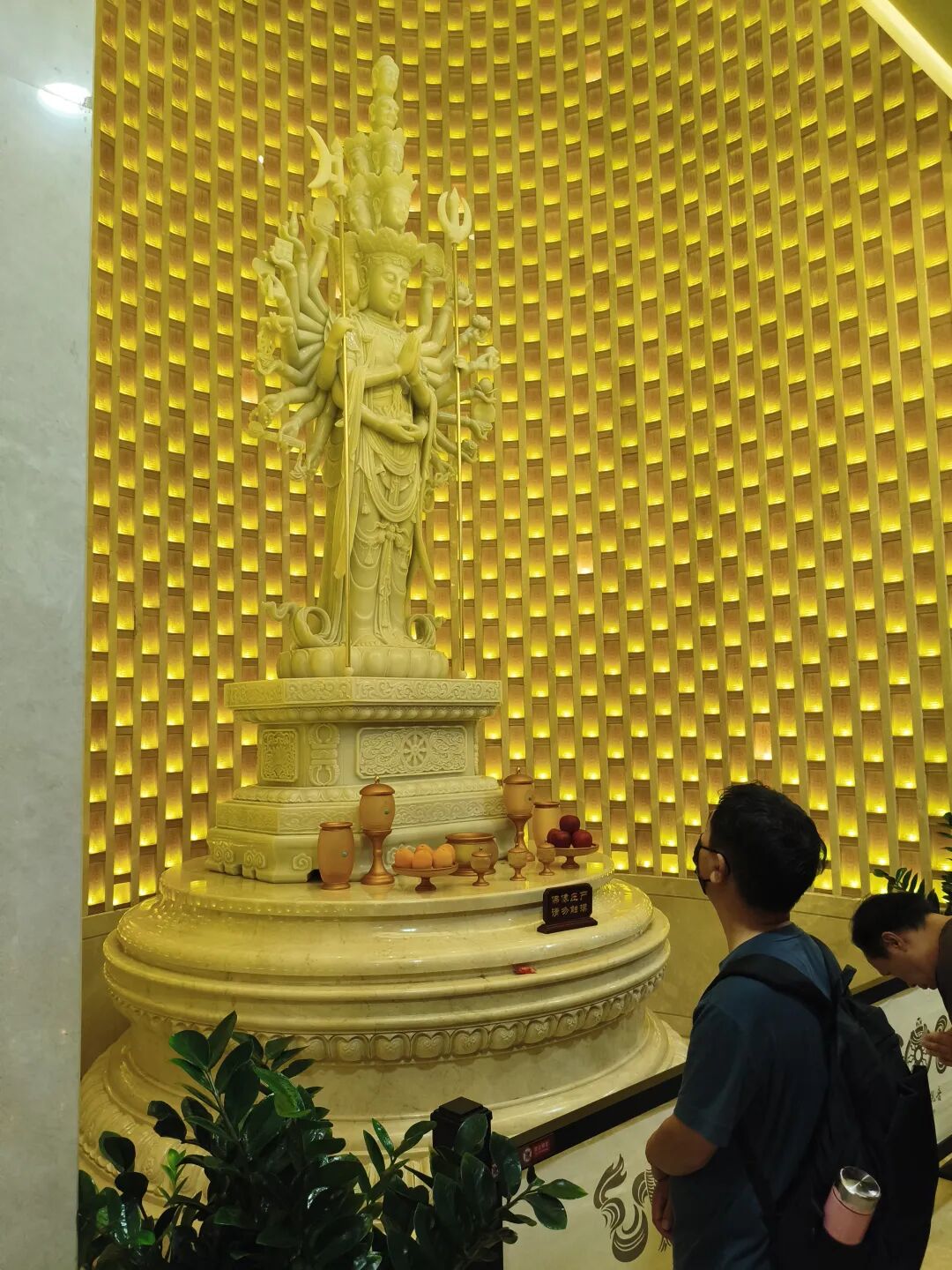 顶礼佛足膜拜完毕,才感觉到被南海强烈紫外线照射的头晕目眩,口干舌燥!没成想,旅游搞成了拜佛,并且不辞辛劳,累并欣慰着!完成了自己的夙愿,开始下楼了,快到三楼的楼梯之下,看到一鐏汉白玉佛千手观音,很有仙气飘飘,肃穆威严,神圣不可侵犯之感。到了三楼,很多人累了这么一大波,早就失去了耐心,心急火燎的继续下楼,出了塔的出口,就再也回不了头了。