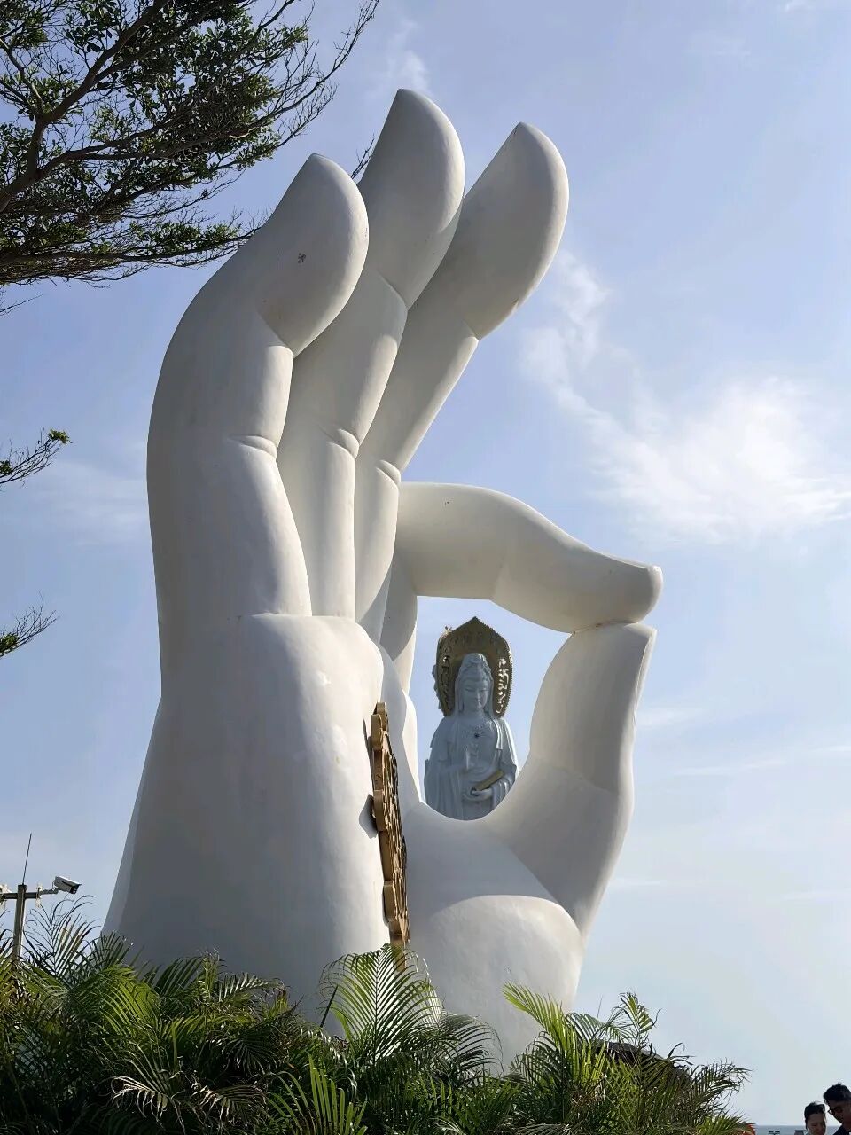 看过妙木山菩提园之后,就走到这个地方了,这里也是通过廊桥进入108米高的菩萨雕塑之前的一个广场。这是一个莲花道场,据说站在这个莲花中心,不仅可以拍到完整的菩萨,更可以参拜四方,心中默念,期盼菩萨保佑,梦想成真!不管你信不信,反正我信!心诚则灵,期盼美好未来,是每个人心中的美好梦想!在广场的两侧,各有一个艺术造型的佛手,我以为是有什么风水或者玄学讲究,绕着每个佛手一周,也没看到任何的文字或者图片说明!不过,拍出的照片效果很好!