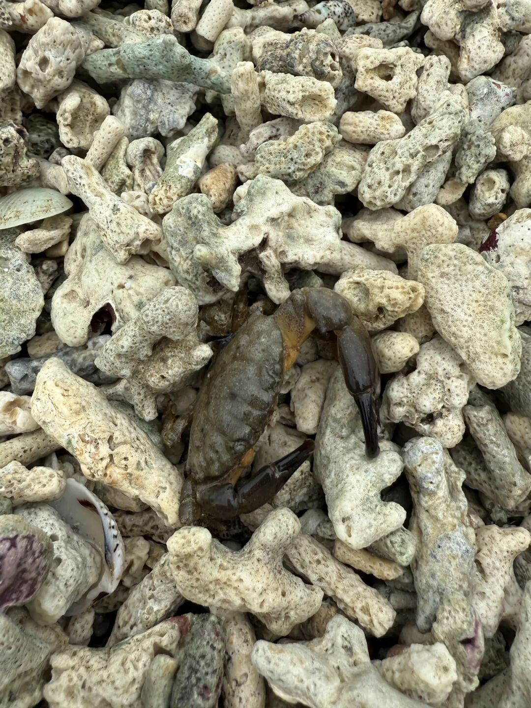 2.牛奶海沙滩边上很多珊瑚石,这个景点很吃天气,如果艳阳高照,能看到海像牛奶一样的乳白色分层,我们去的时候是阴天,没有看到牛奶海。珊瑚石里有很多小贝壳,还遇到一只被海水冲上岸的小螃蟹🦀。