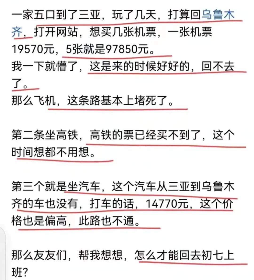 但人在被逼急的时候,甚至会考虑打车回乌鲁木齐。