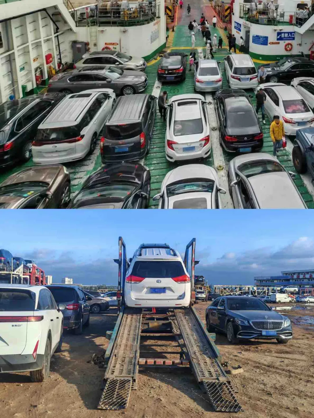 船上摩肩接踵,车门都打不开;船下等待上船的车没地方停,在港口旁边的废弃工地聚成一团。