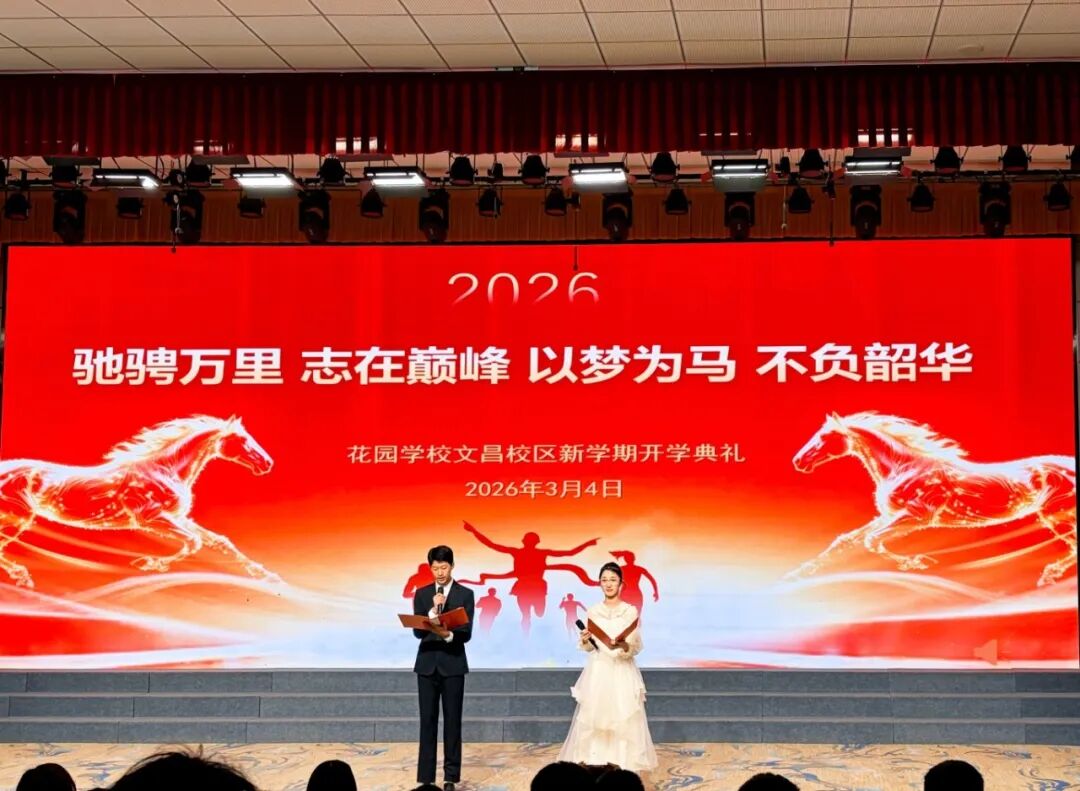春和景明,启序新章;文昌启序,逐梦远航。伴着和煦春风与明媚晨光,花园学校文昌校区全体师生齐聚校园,隆重举行“驰骋万里 志在巅峰 以梦为马 不负韶华”春季开学典礼。全体师生以青春之名集结、以梦想之姿启航,在庄重热烈的氛围中回望奋斗足迹、立下新学期誓言,共同开启充满希望与荣光的崭新征程。