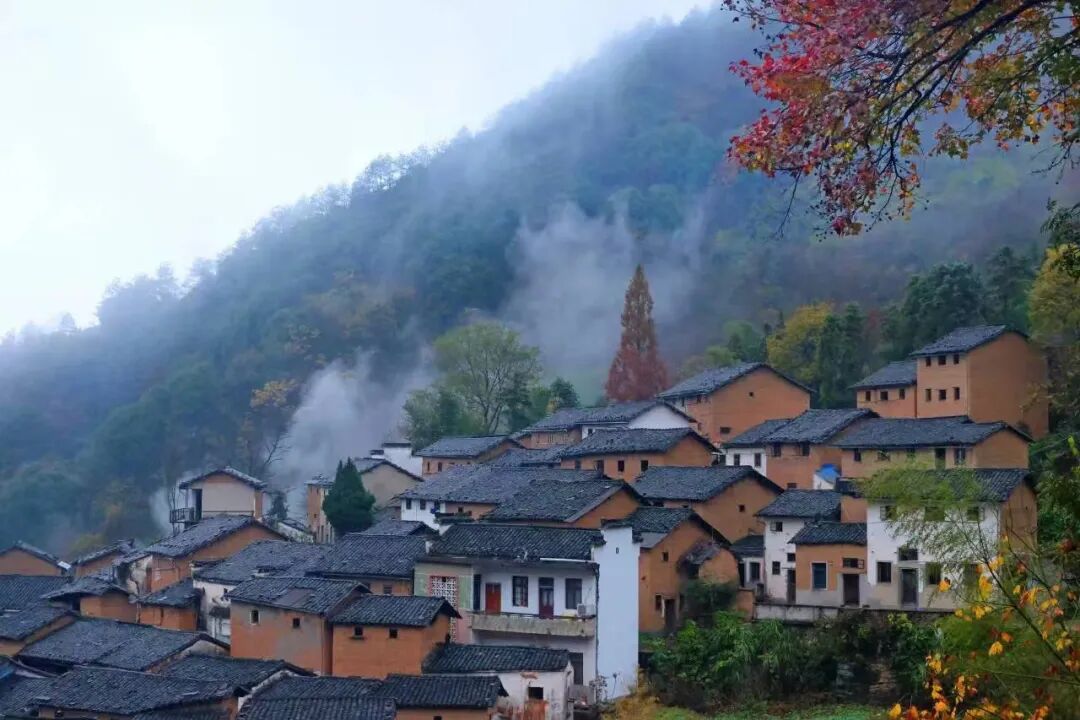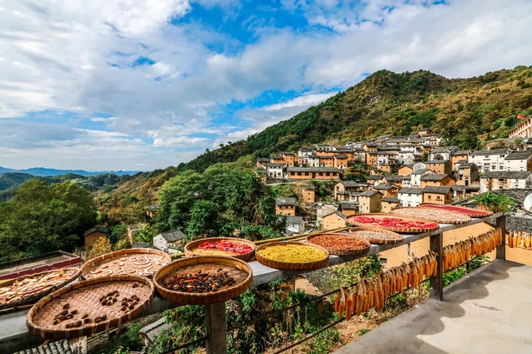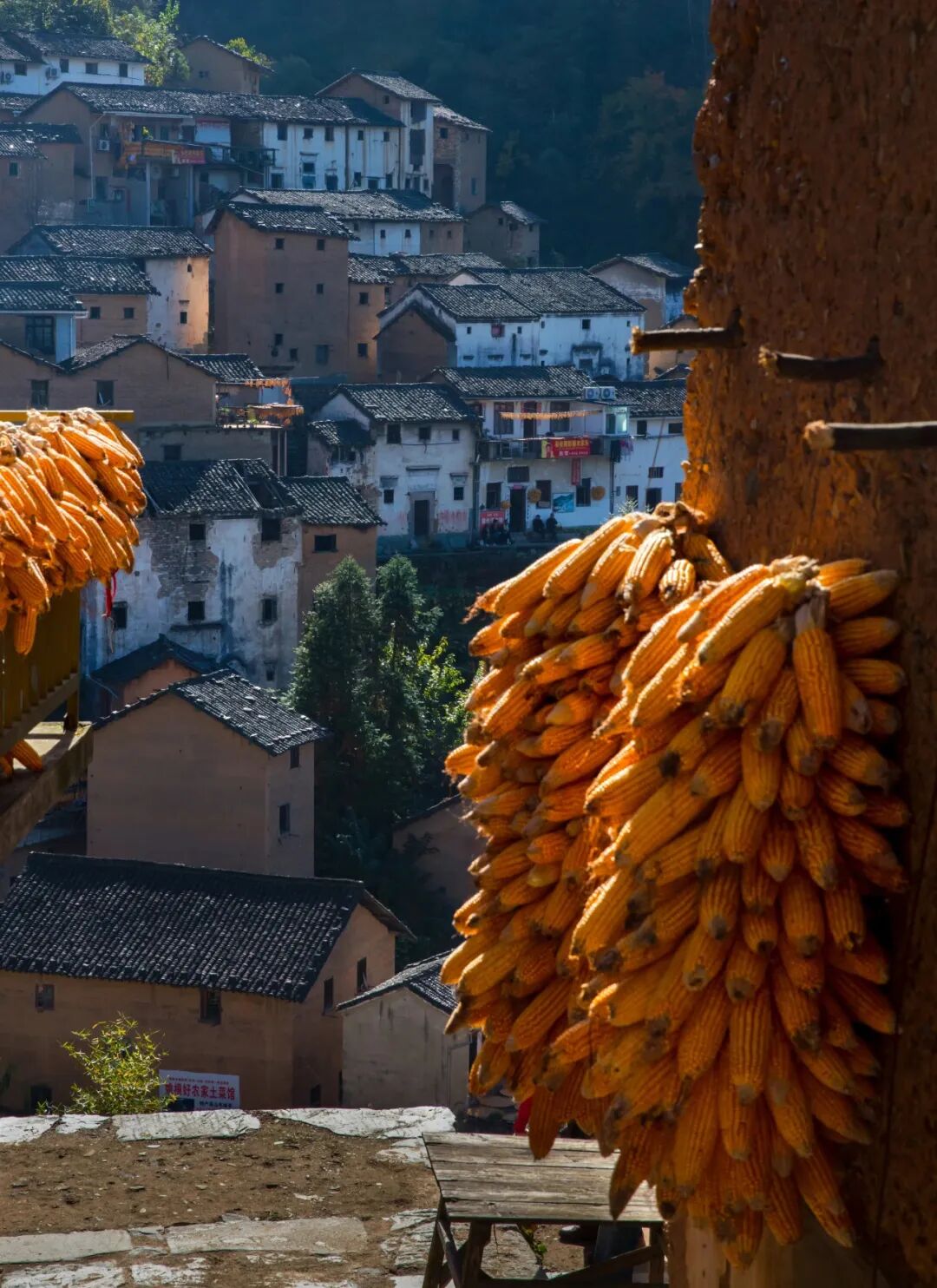村里的房屋,有的是古建的马头墙、有的是土楼,白黄相间,仿若人在画中。对面“之”字形盘山公路像一条彩带缠绕在山脊。犹如一幅天然田园画,十分壮美