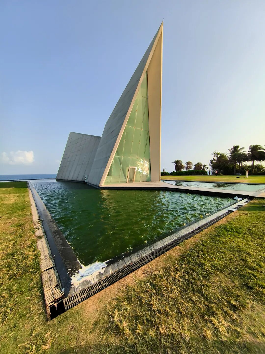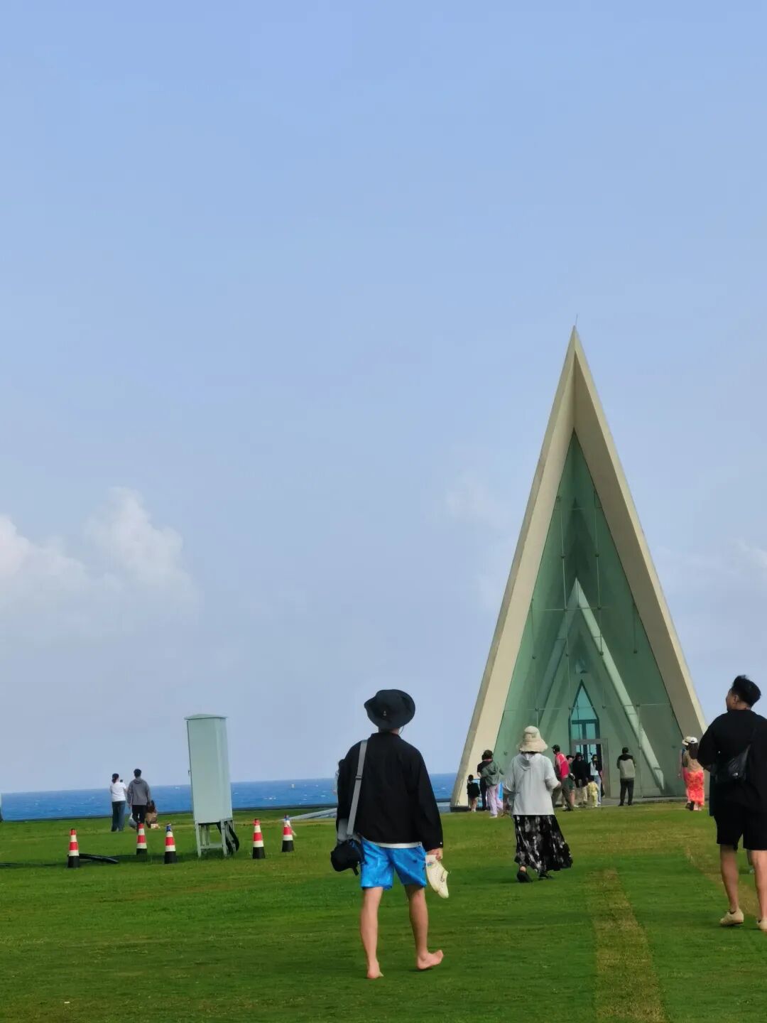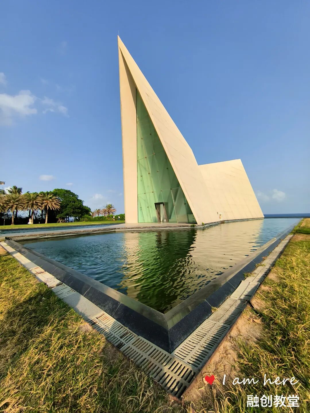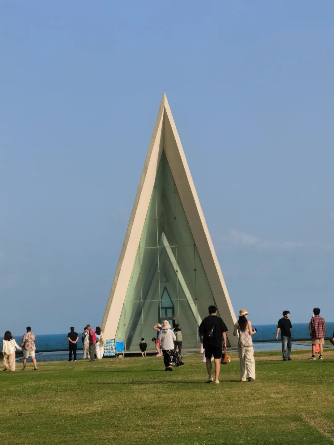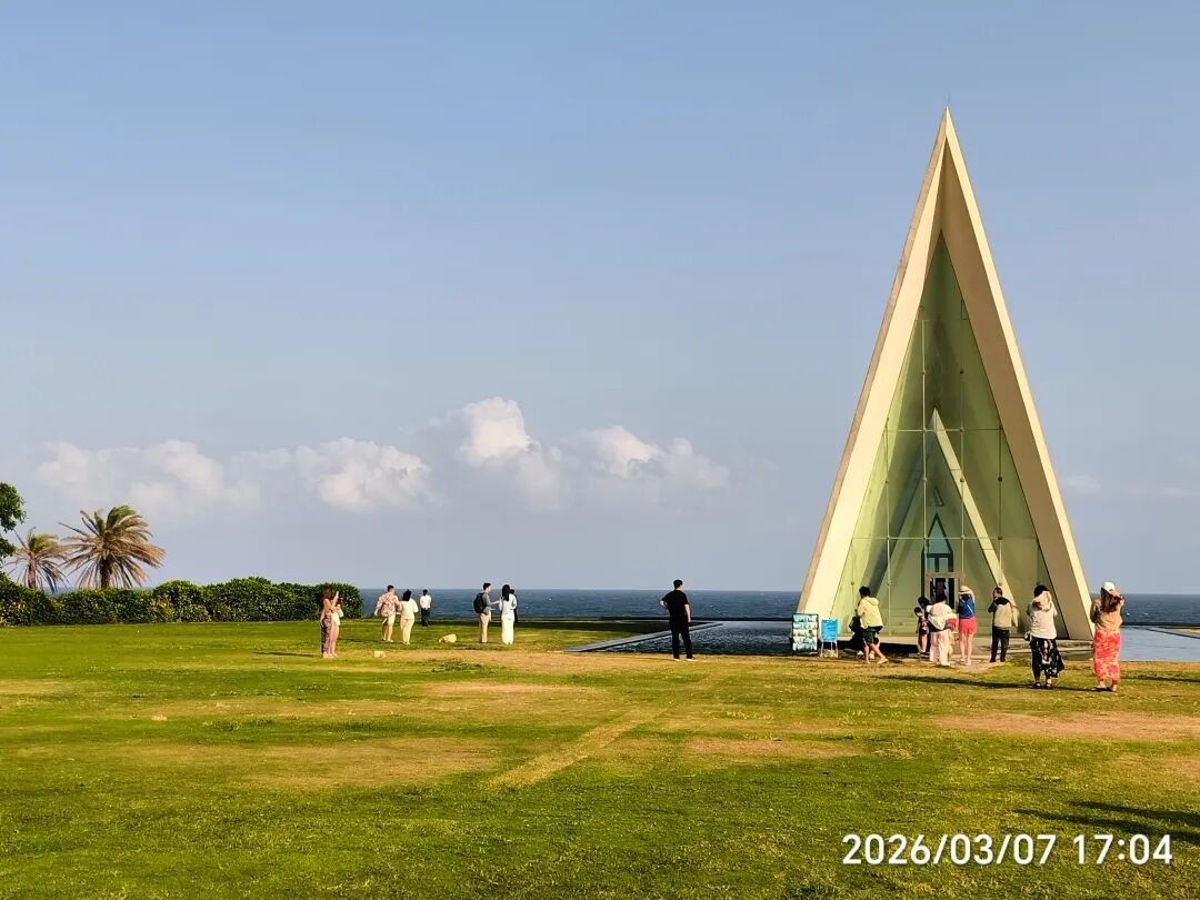 骑电动车去日岛,打卡一个标志性海边建筑,网红景点:融创教堂。教堂以其独特的白色三角设计和绝佳的海景位置成为热门旅游点: