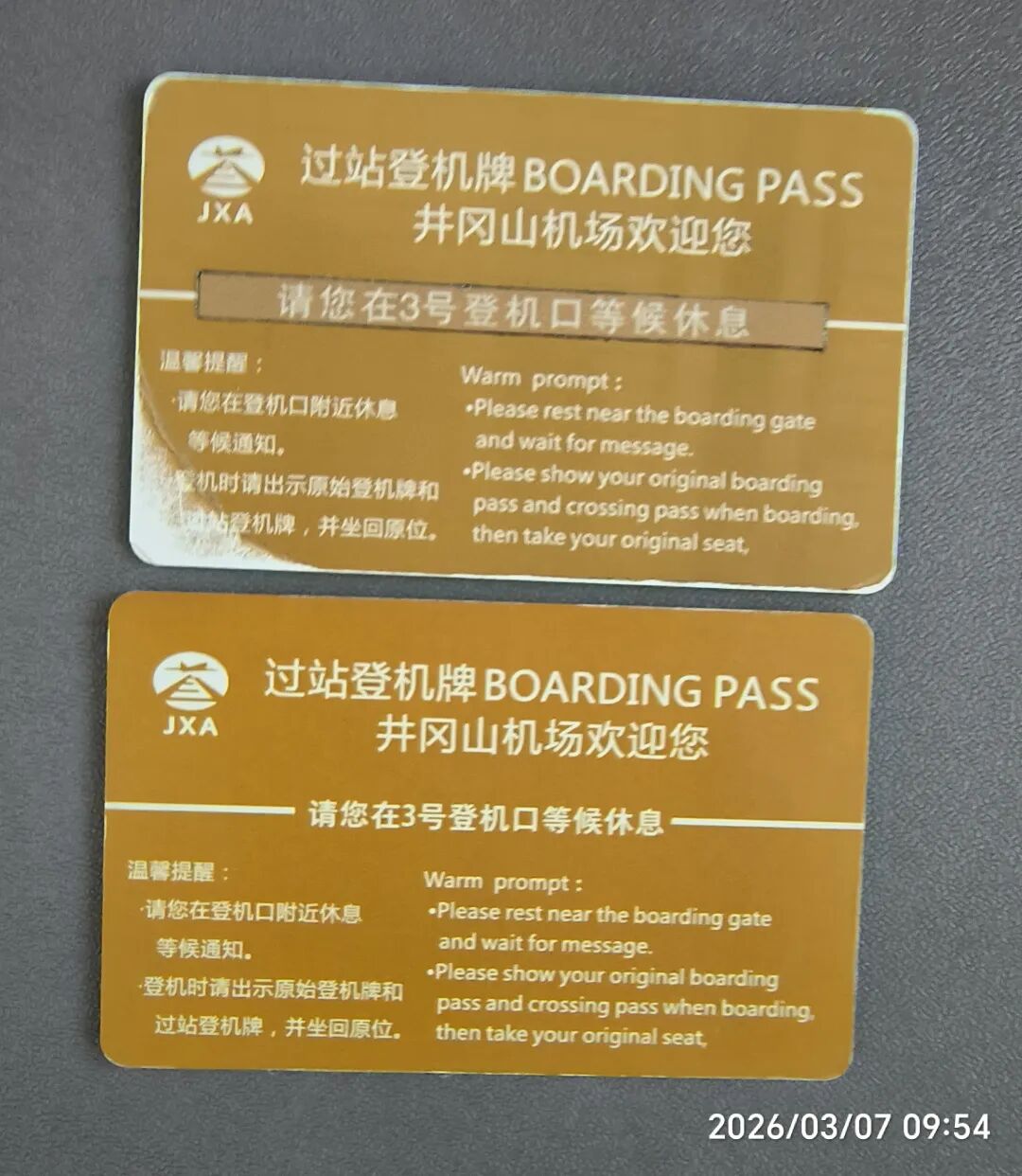 因为要和江西的外公外婆汇合,所以选择了经停井冈山的航班,9点18分抵达经停的井冈山机场。过站的登机牌挺好的: