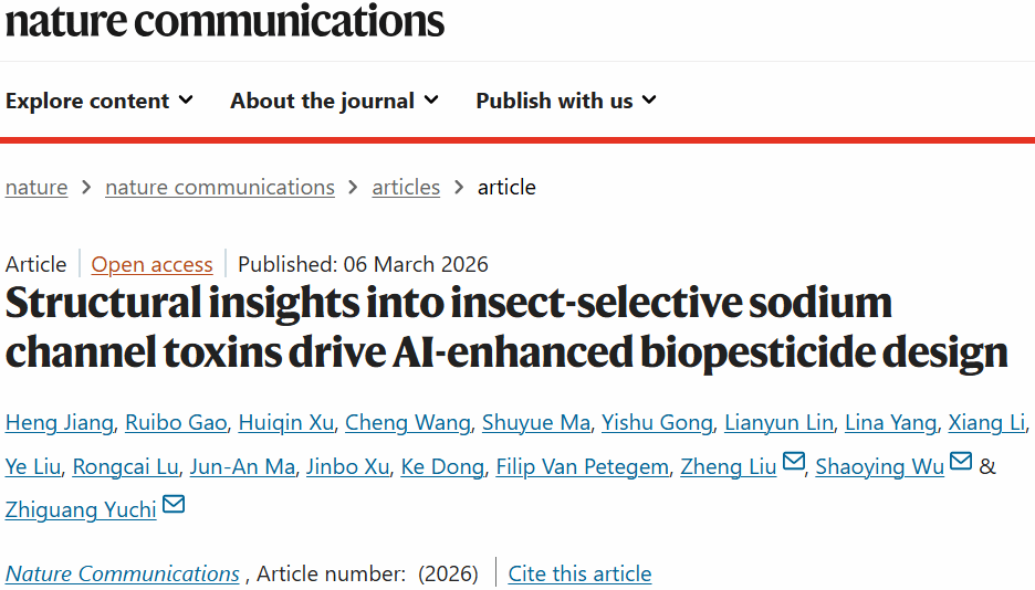 近日,海南大学南繁学院吴少英教授领衔的热带作物安全生产关键技术研发与应用团队,在国际知名期刊《Nature Communications》上发表了题为《Structural insights into insect-selective sodium channel toxins drive AI-enhanced biopesticide design》的重要研究成果。该研究不仅深入剖析了天然动物源杀虫多肽如何精准调控昆虫钠离子通道的分子机理,还创新性地融合人工智能技术实现了多肽分子的理性优化,为创制新一代高效、绿色的生物农药奠定了坚实的理论与技术基石。