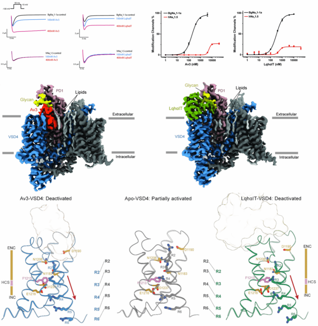 在此背景下,吴少英团队聚焦于两种典型的天然神经毒素海葵毒素Av3和蝎毒素LqhαIT,成功解析了它们与昆虫电压门控钠离子通道的结构互作细节。研究发现,这两种多肽能显著抑制昆虫(以德国小蠊为例)钠通道BgNav1-1a的快速失活过程,从而持续干扰神经信号传导,导致昆虫死亡;然而,它们对哺乳动物钠通道hNav1.5几乎不产生任何影响。通过冷冻电镜技术,研究人员观察到这些多肽主要结合在钠通道的第四电压感受结构域(VSD4),通过改变通道构象来阻断其正常的失活机制。
