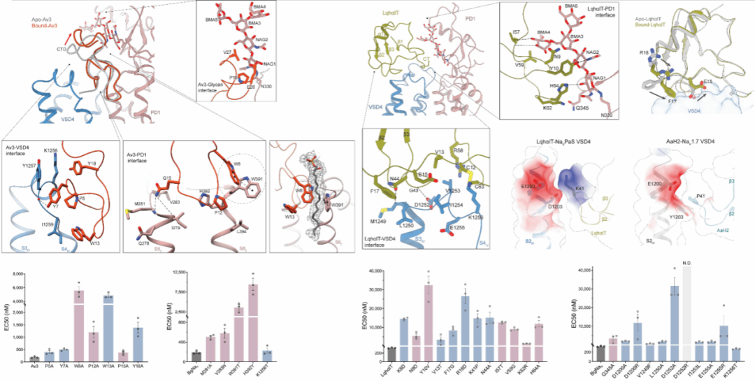 为了进一步揭示其物种选择性的分子根源,团队结合了突变扫描、表面等离子共振及电生理功能分析等多种手段,精准定位了决定多肽高选择性识别的关键界面残基。这些残基如同“分子钥匙”,能精确匹配昆虫钠通道特有的结构锁孔,从而形成高亲和力结合,而对哺乳动物通道则“视而不见”。例如,Av3毒素中的Trp8和Pro12残基,以及LqhαIT毒素中的Asn44和His64残基,被证实对结合活性至关重要;一旦将这些位点突变为丙氨酸,毒素的结合亲和力与杀虫功效便急剧下降,其中LqhαIT的活性甚至降低了数十倍。这一发现首次在系统层面阐明了动物源杀虫多肽实现昆虫特异性的分子机制。