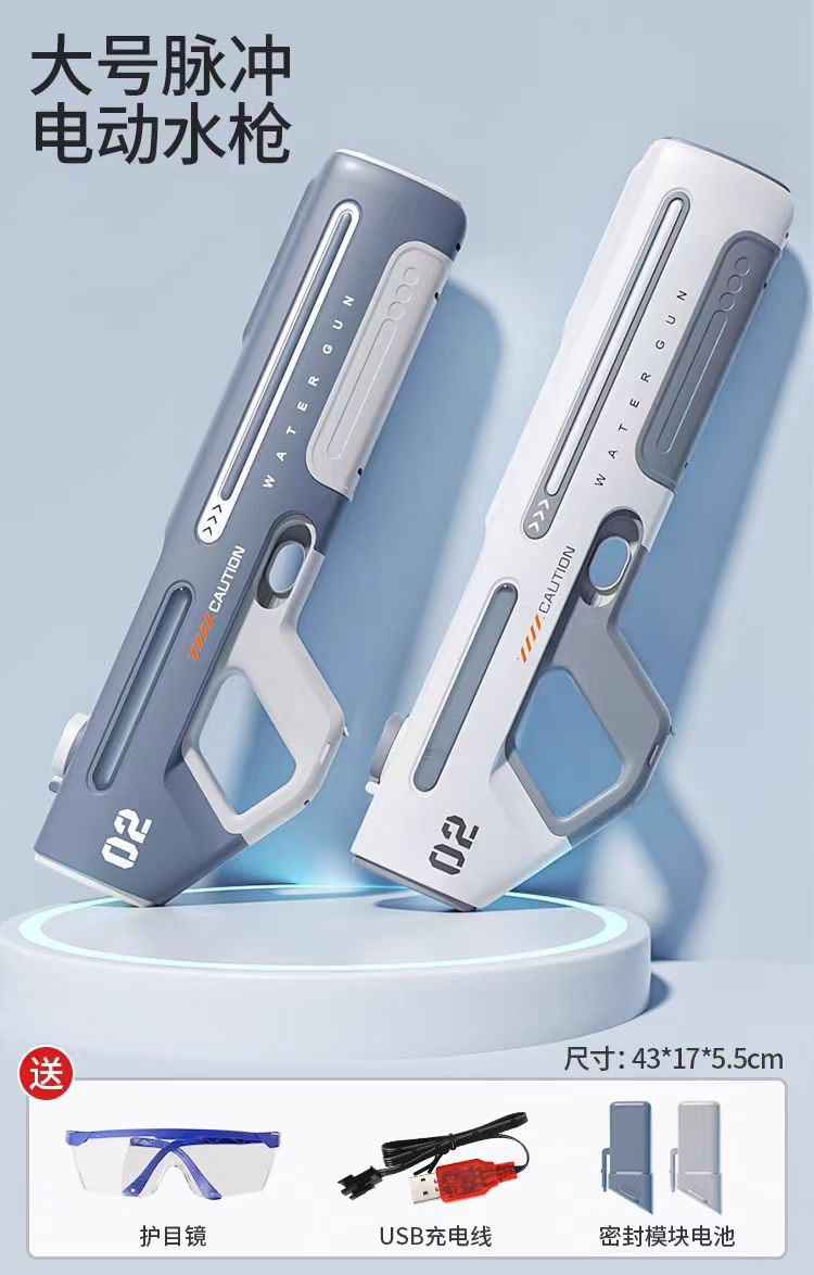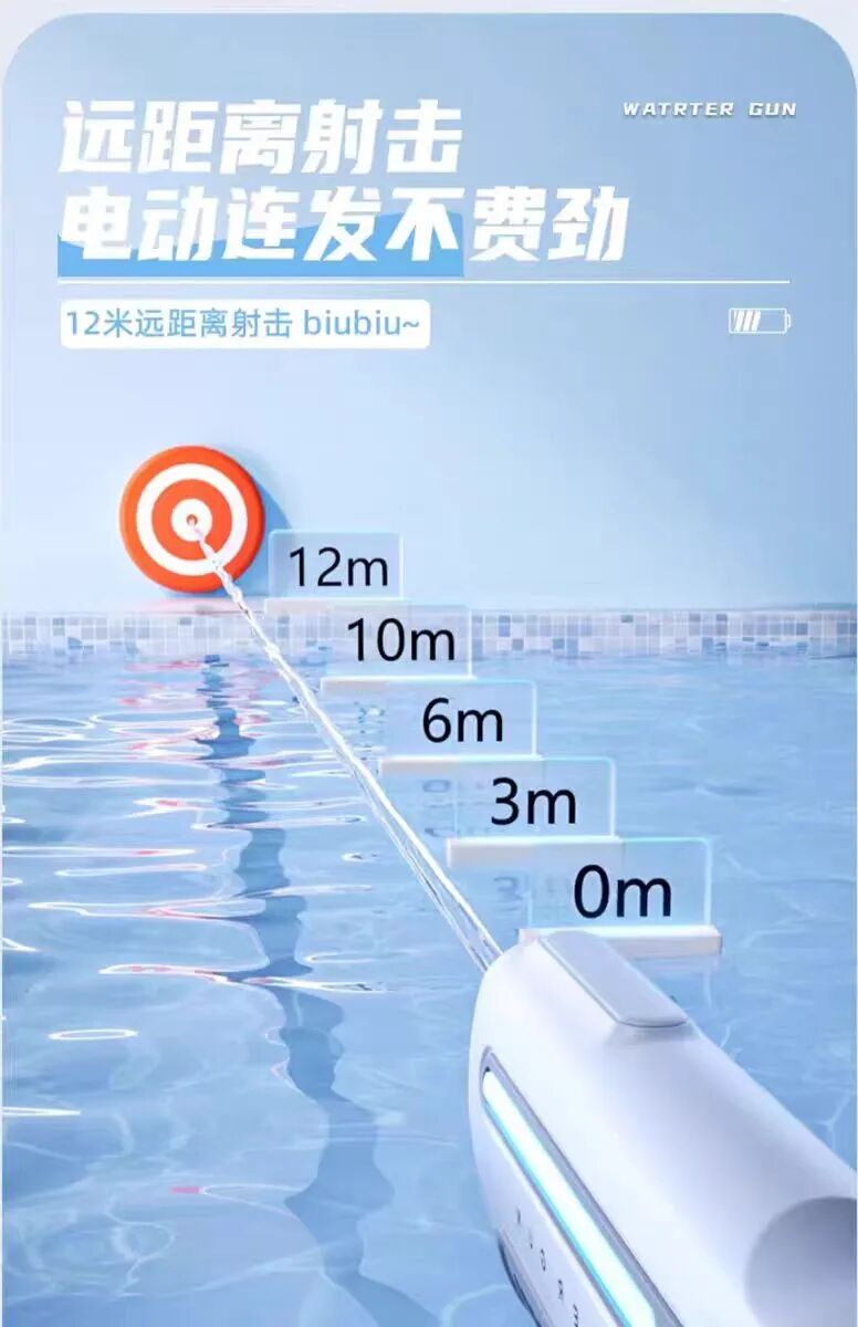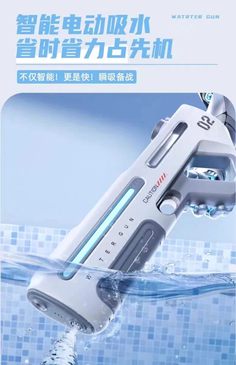 目前市面上大火的电动水枪,全身ip7级防水,射程约为10米左右,储水量1000ml且自动吸水。侧面带有炫彩灯光,整体续航60分钟左右。