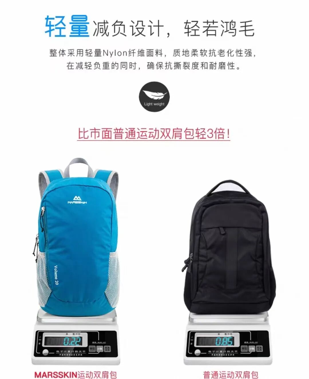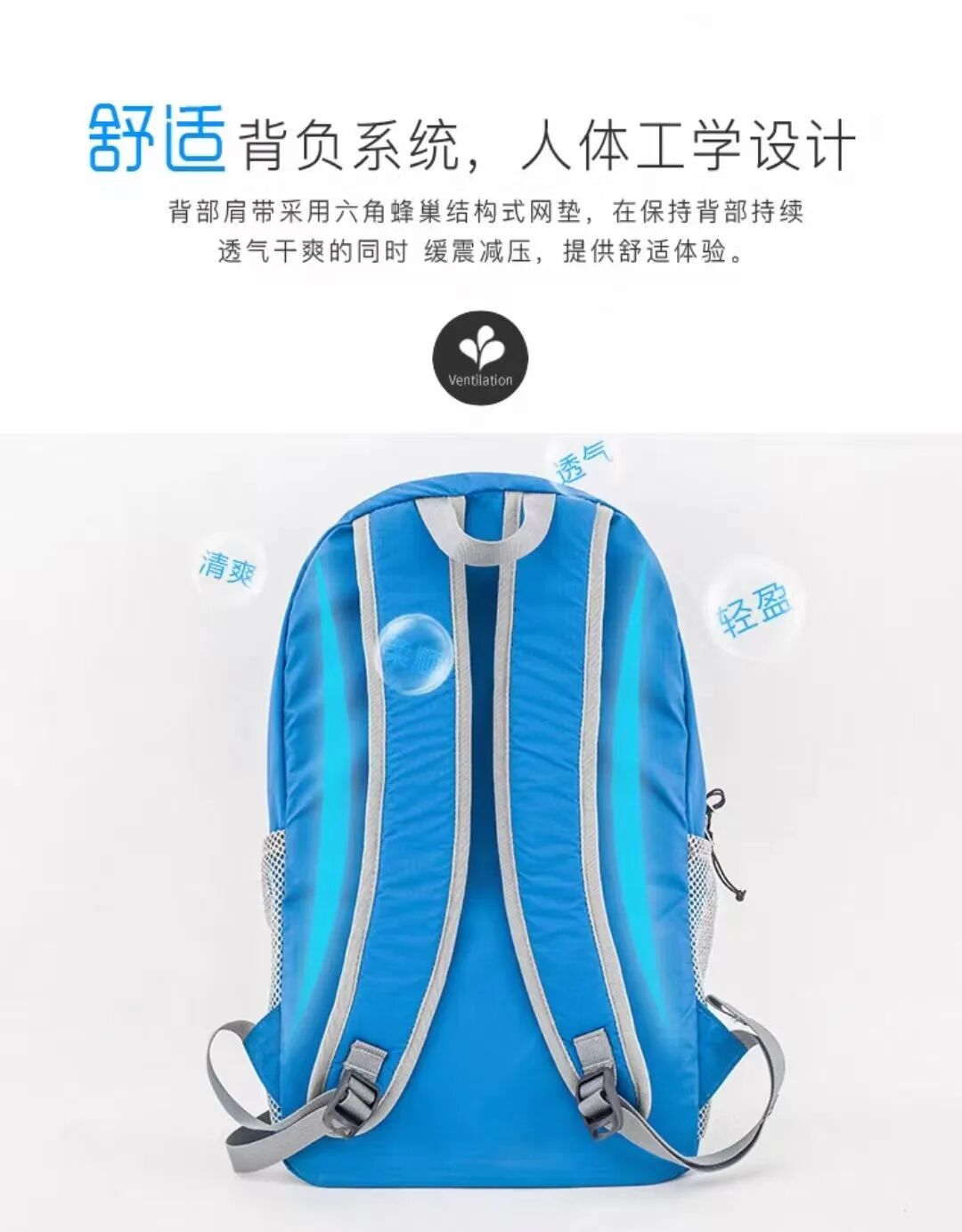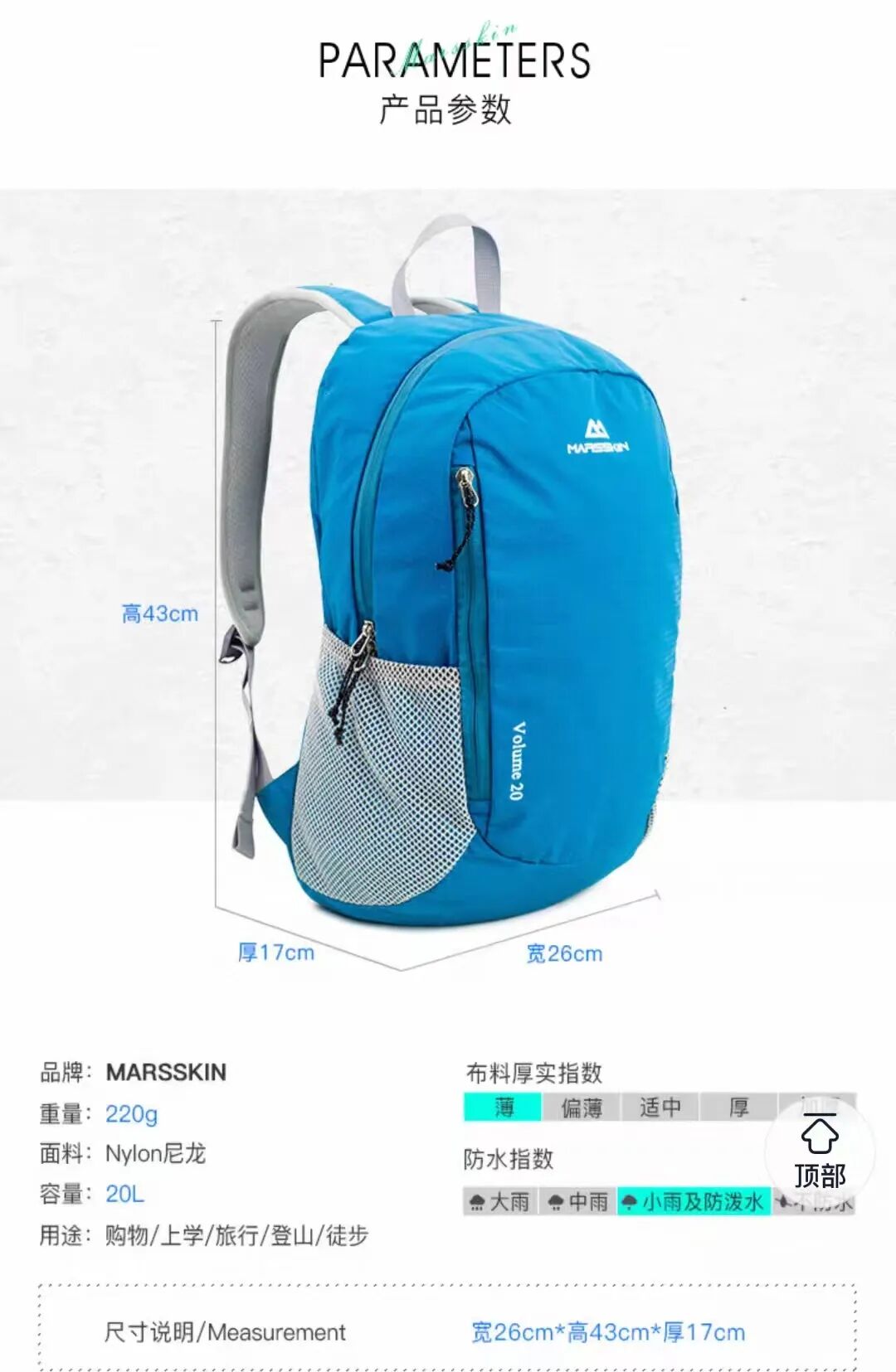 20升容量双肩户外背包,比普通运动背包轻三倍以上,拥有舒适背负系统,人体工学设计。背部采取蜂窝状结构,在保证背部持续透气干爽的同时减缓背负压力,提供舒适徒步体验。肩带采取8.2毫米厚肩背带,提供舒适负重体验,拒绝勒肩。