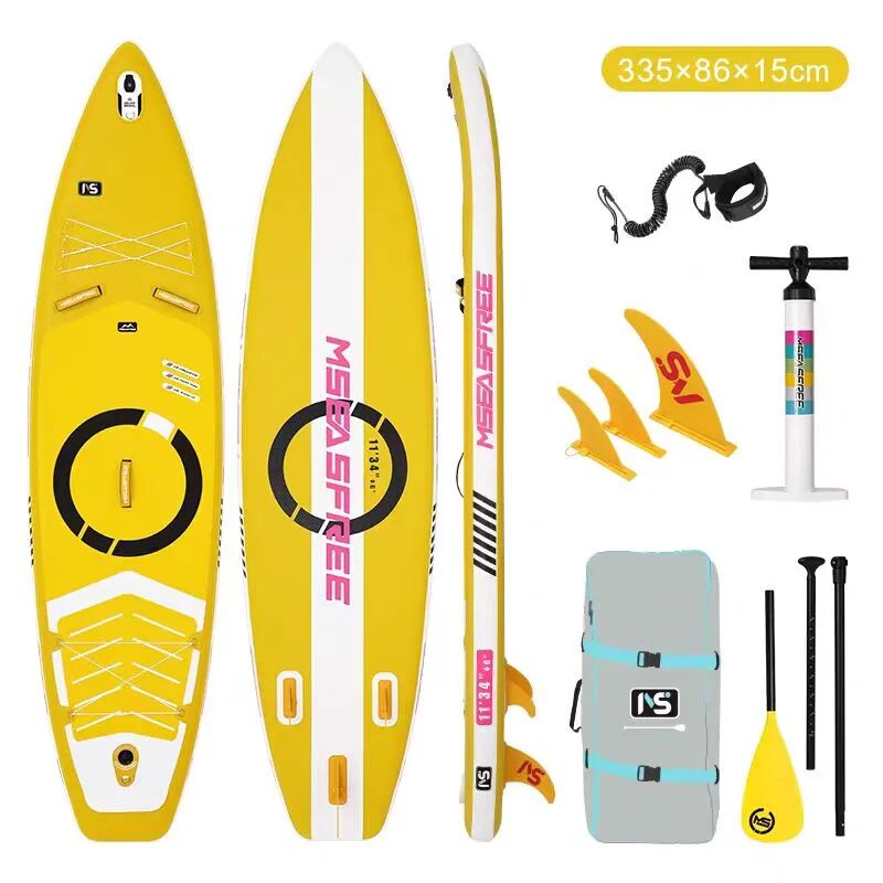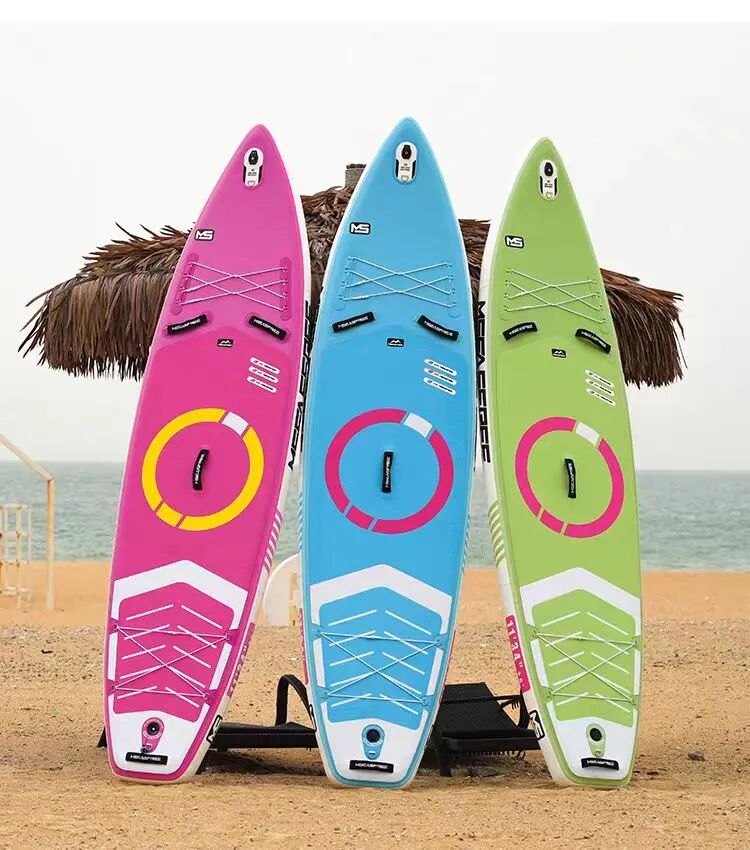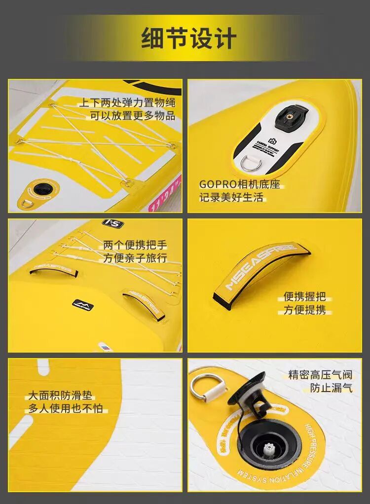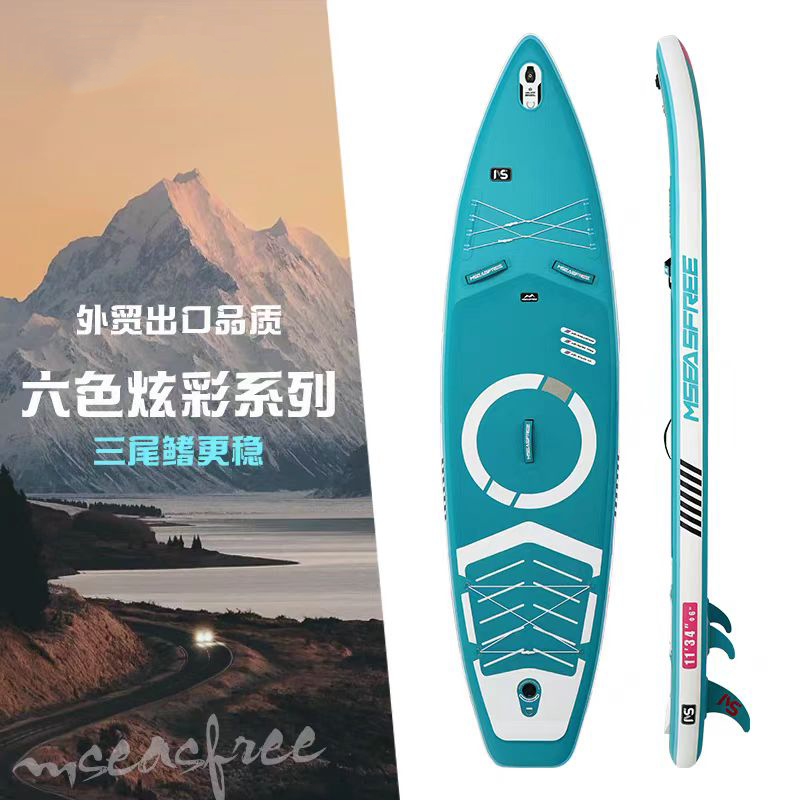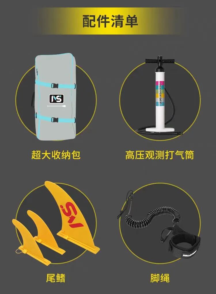 sup充气运动桨板,夏季水上活动明星产品。加厚PVC材料,内部采取拉丝工艺增强桨板整体强度,外部结合PVC基布层及双层加厚侧扁裙带,保障游玩安全性。配件包括:收纳包、打气筒、尾鳍、脚绳、救生衣、防水小包,且拥有多种颜色可供选择。