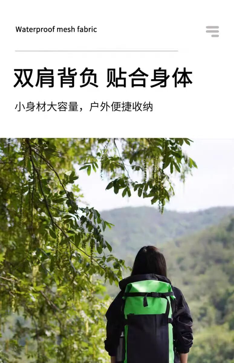 夏季玩水的必备物品,30L大容量保障您的随身物品防水需求,衣物可做干湿分离。可适用于游泳、溯溪、漂流、桨板、探险等场景。