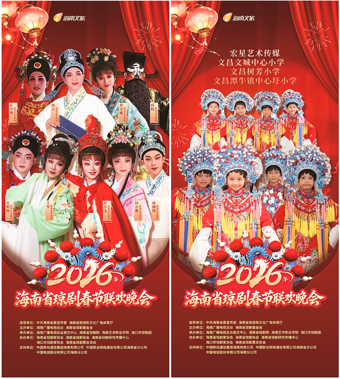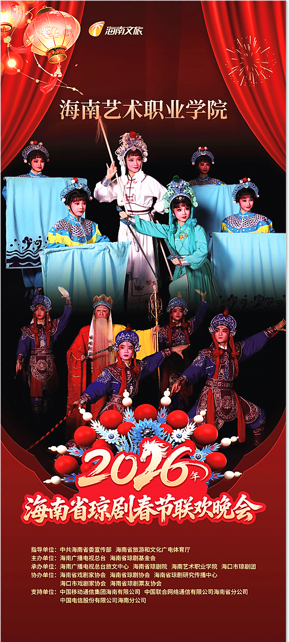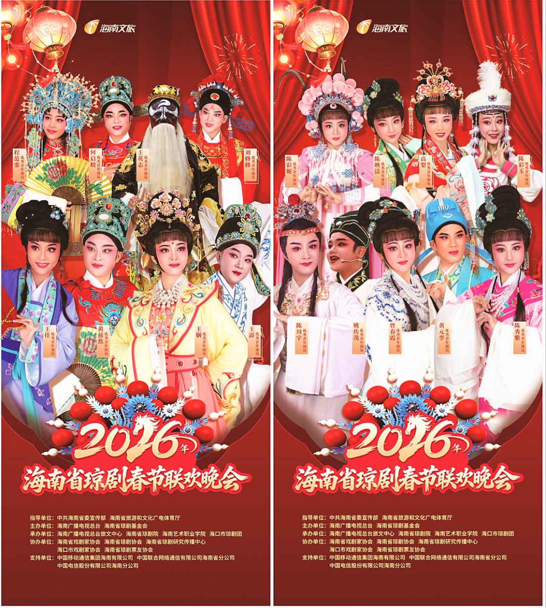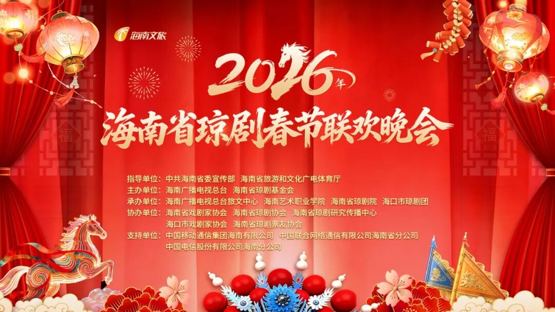 名家荟萃呈盛景,雅韵流芳贺岁长。由中共海南省委宣传部、海南省旅游和文化广电体育厅指导,海南广播电视总台、海南省琼剧基金会主办, 海南广播电视总台旅文中心、海南省艺术职业学院、海南省琼剧院、海口市琼剧团承办,海南省戏剧家协会、海南省琼剧协会、海南省琼剧研究传播中心、海口市戏剧家协会、海南省琼剧票友协会协办,中国移动通信集团海南有限公司、中国联合网络通信有限公司海南省分公司、中国电信股份有限公司海南分公司支持的2026年海南省琼剧春节联欢晚会即将在2月1日15:00精彩上演。晚会主题为“琼韵焕新·情满自贸港”,以经典、传承、韵脉、融创四大篇章为脉络,紧扣海南自贸港封关运作时代脉搏,为广大戏迷呈现精彩多元、亮点纷呈的节目,尽显中华戏曲的传承之美与创新之力。