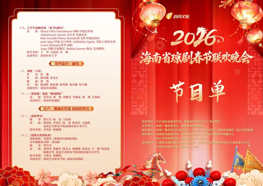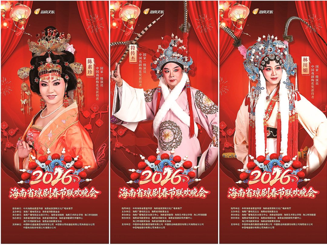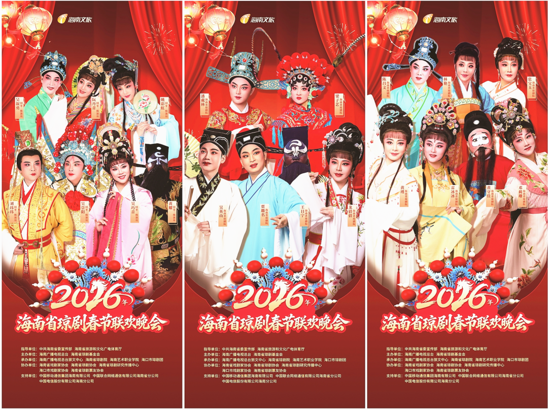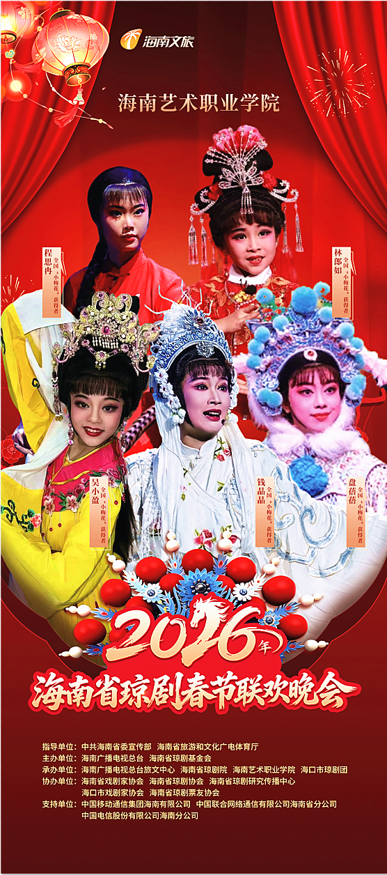 名家荟萃呈盛景,雅韵流芳贺岁长。由中共海南省委宣传部、海南省旅游和文化广电体育厅指导,海南广播电视总台、海南省琼剧基金会主办, 海南广播电视总台旅文中心、海南省艺术职业学院、海南省琼剧院、海口市琼剧团承办,海南省戏剧家协会、海南省琼剧协会、海南省琼剧研究传播中心、海口市戏剧家协会、海南省琼剧票友协会协办,中国移动通信集团海南有限公司、中国联合网络通信有限公司海南省分公司、中国电信股份有限公司海南分公司支持的2026年海南省琼剧春节联欢晚会即将在2月1日15:00精彩上演。晚会主题为“琼韵焕新·情满自贸港”,以经典、传承、韵脉、融创四大篇章为脉络,紧扣海南自贸港封关运作时代脉搏,为广大戏迷呈现精彩多元、亮点纷呈的节目,尽显中华戏曲的传承之美与创新之力。
