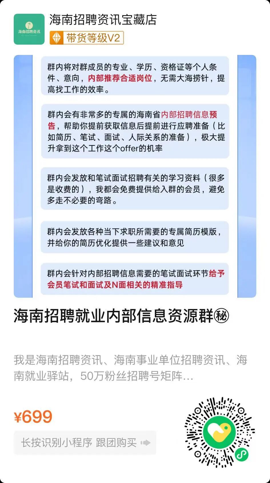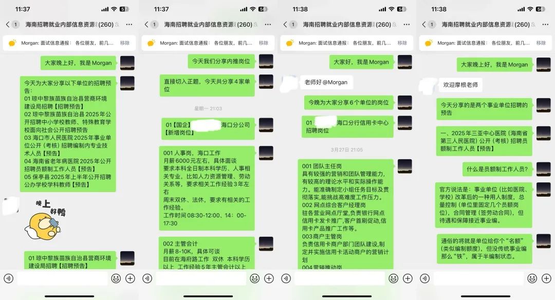 02 群内会有非常多的专属的海南省内部招聘信息预告,帮助你提前获取信息后提前进行应聘准备(比如简历、笔试、面试、人际关系的准备),极大提升拿到这个工作这个offer的机率