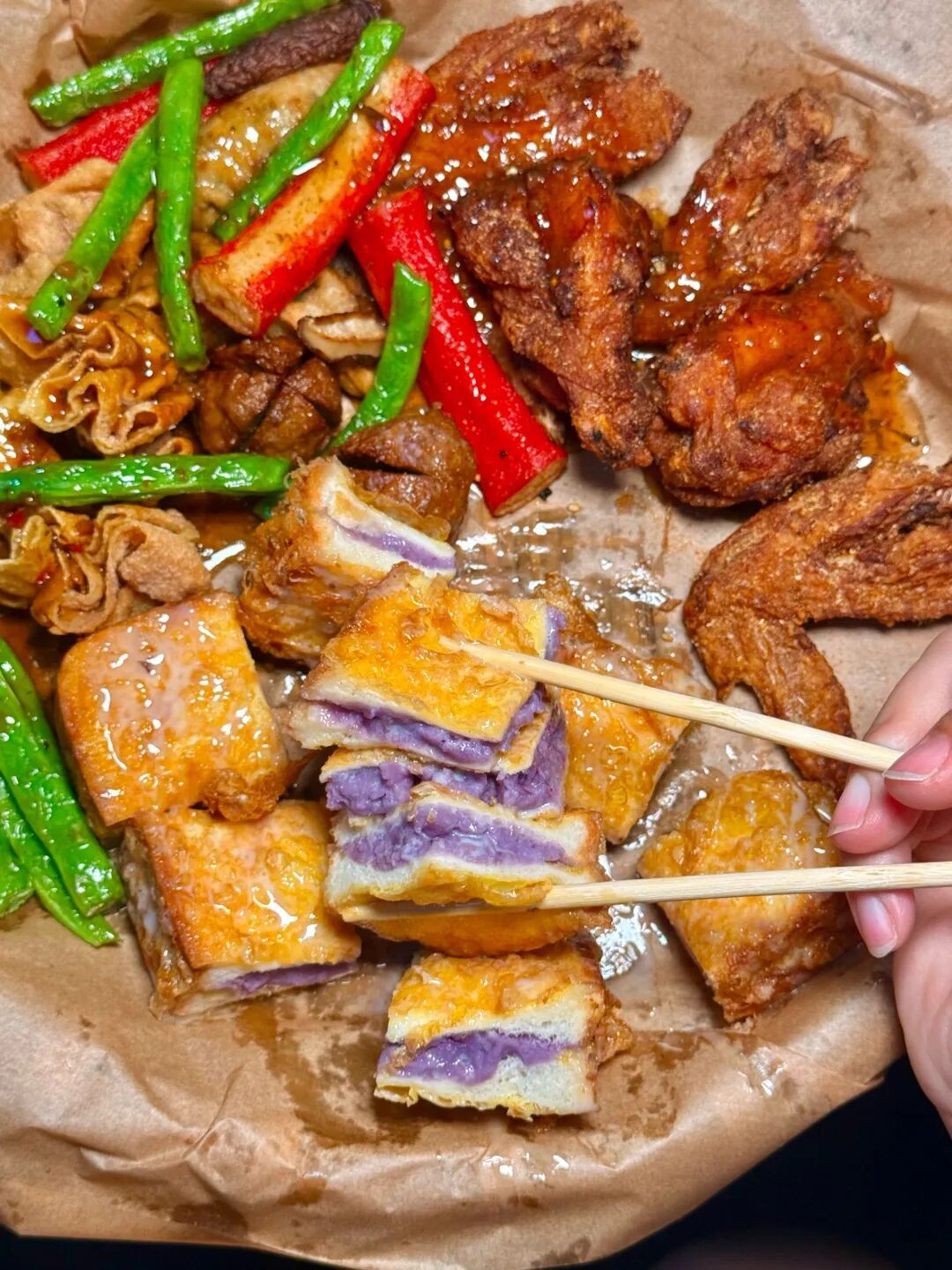 5、炸炸:肉丸、蔬菜穿成串,现炸后淋上秘制酱汁,外酥里嫩。