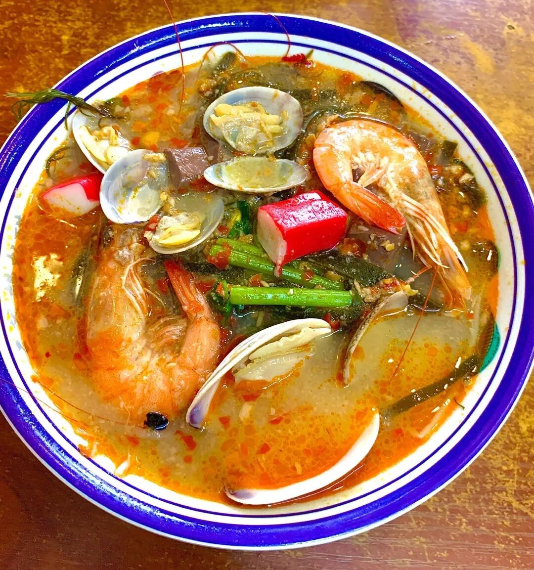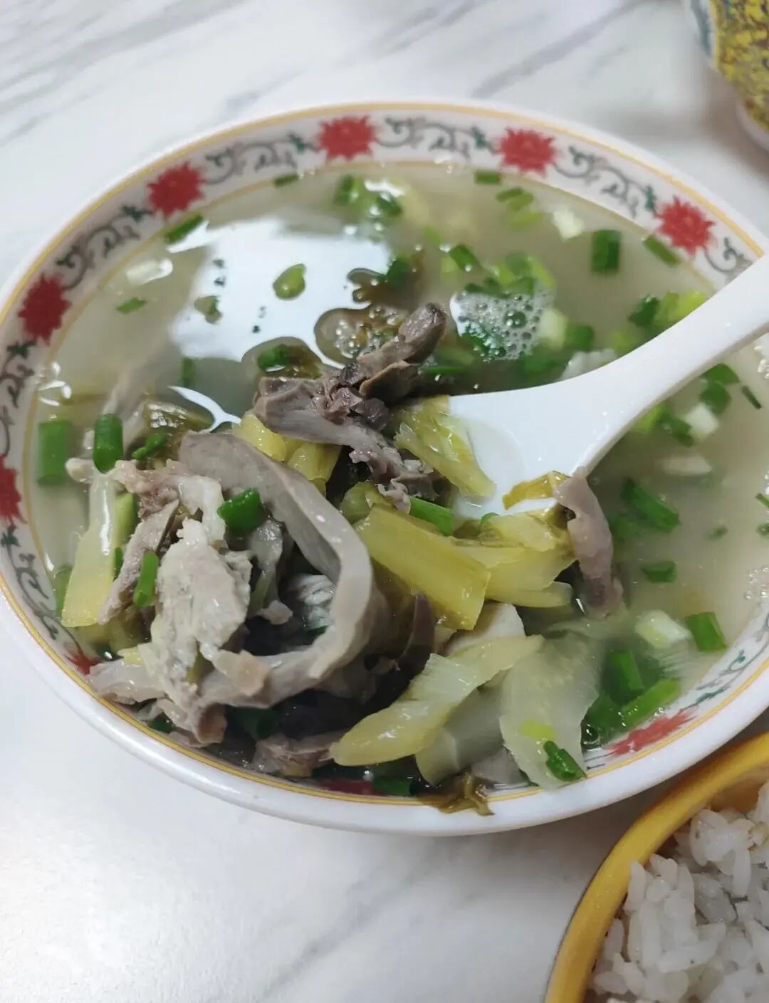 6、辣汤饭:水巷口辣汤饭是海口早餐灵魂,白胡椒和猪杂熬制的辣汤酸辣开胃,配腊肠和煎蛋。