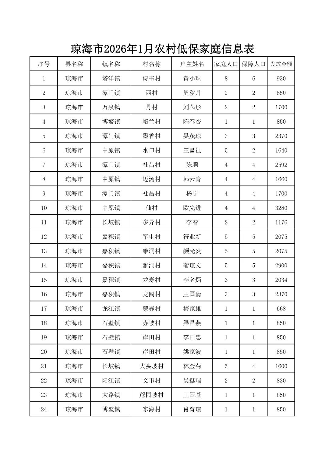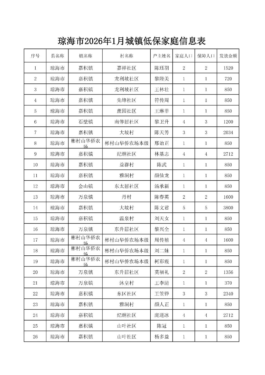 附:1.琼海市2026年1月城镇低保家庭信息表