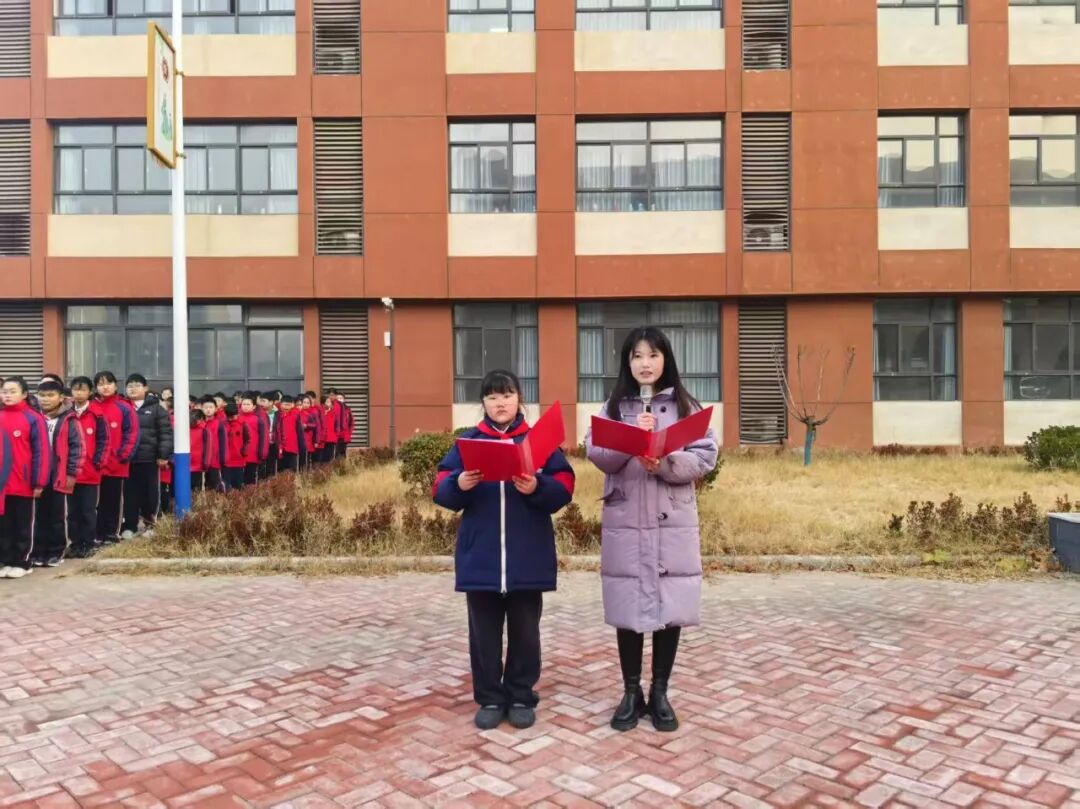 升旗礼毕,房艳芬老师和赵安琪老师以“以梦为马,喜迎新年”为主题进行国旗下演讲。她们讲到:“ 马象征着奋进、执着与力量,而梦想就是我们前行路上最珍贵的行囊。回首过去一年,同学们在课堂上求知若渴,在运动场上奋勇拼搏,在校园活动中绽放光彩。新的一年,是新的起点,更是追梦的新征程。也许你梦想成为知识渊博的学者,那就从认真听好每一堂课、仔细完成每一次作业做起;也许你梦想成为勇敢担当的少年,那就从主动帮助他人、勇于承担责任开始。”最后,她们为大家送上新年的美好祝愿 :以梦为马,不负韶华,在新的一年里,做勤奋的学习者,脚踏实地,探索未知;做善良的同行者,温暖他人,团结互助;做勇敢的追梦者,不惧挑战,勇往直前。