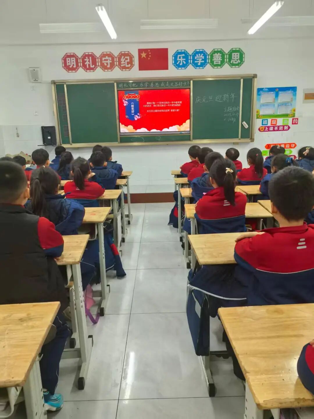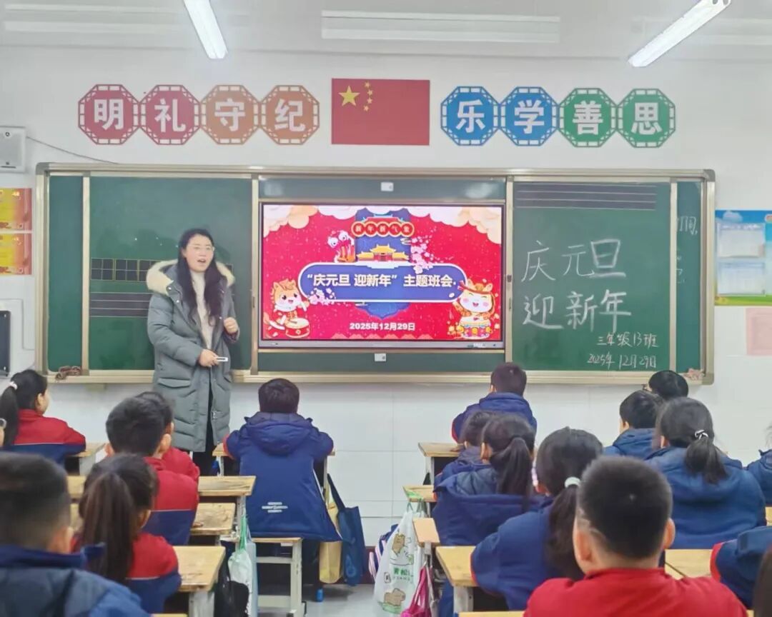 班会围绕“元旦由来”“传统文化”“新年祝福”三个板块展开。班主任为同学们讲解了“元旦”的含义、起源、发展、元旦故事传说及节日意义,共同诵读《元日》等诗篇,感受文化传承。在互动环节,同学们积极分享新年愿望,老师也鼓励大家在新一年里保持积极心态、学会合作、勤奋向上,并提醒注意节日安全。各班教室温馨喜庆,洋溢着浓厚的节日气氛。