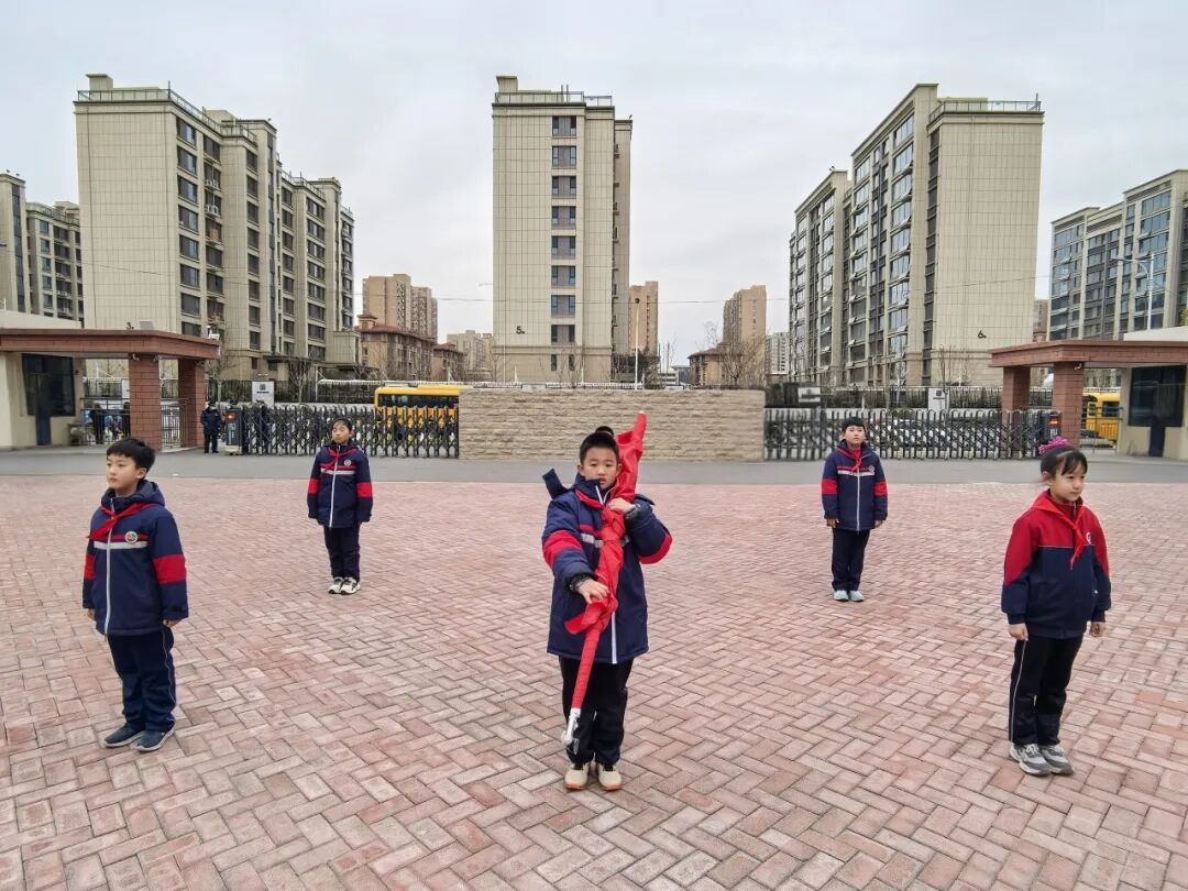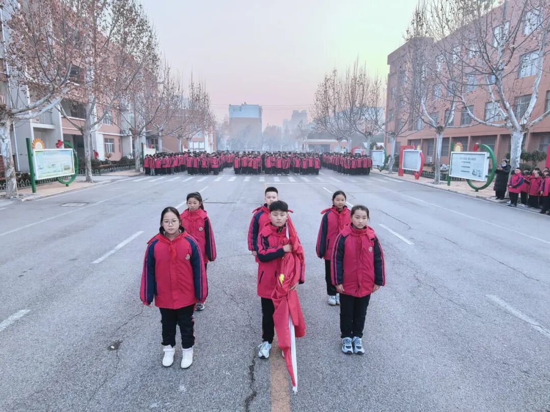 护旗手踏着整齐有力的步伐,护送鲜艳的五星红旗走向升旗台。当激昂的《义勇军进行曲》响起,全体师生肃立行注目礼,凝视国旗在晨光中冉冉升起。飘扬的国旗与初升的朝阳交相辉映,为新一年的征程拉开了庄严的序幕。