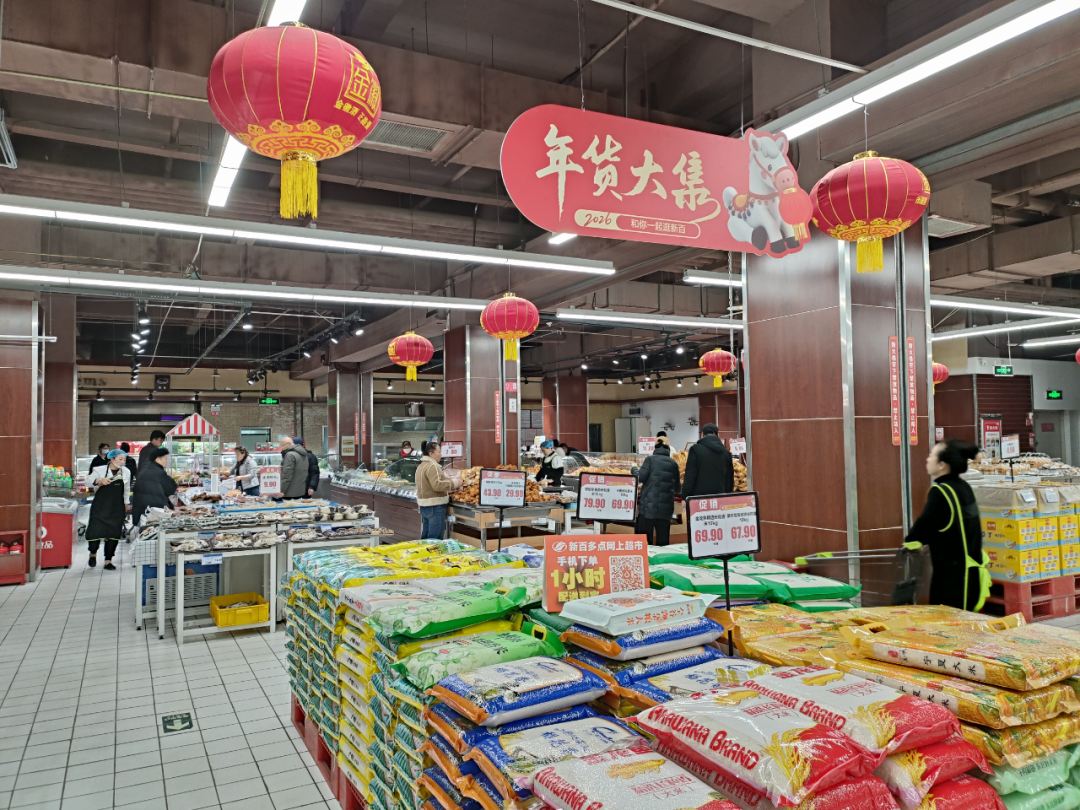“现在办年货太方便了,走出家门不管是去超市还是去市场,东西又全又新鲜,用上消费券更划算,每天还有七八场活动轮番上演,这过年的味道一下子就出来了!”正在雍楼市场“浪大集”的张阿姨笑着说道。今年的年货节不仅仅是商品的集会,更是传统年俗文化的生动展示。民俗展演、写春联送福字等每天7至8场次的主题活动在轮番登场,红红的春联、大大的“福”字、精美的窗花随处可见,不少市民手持年货,脸上洋溢着幸福的笑容。商家们更是铆足干劲,备足货源,推出各类优惠让利活动,不仅点燃了市民的消费热情,更让整座城市在购销两旺中升腾起浓浓的节日“烟火气”。