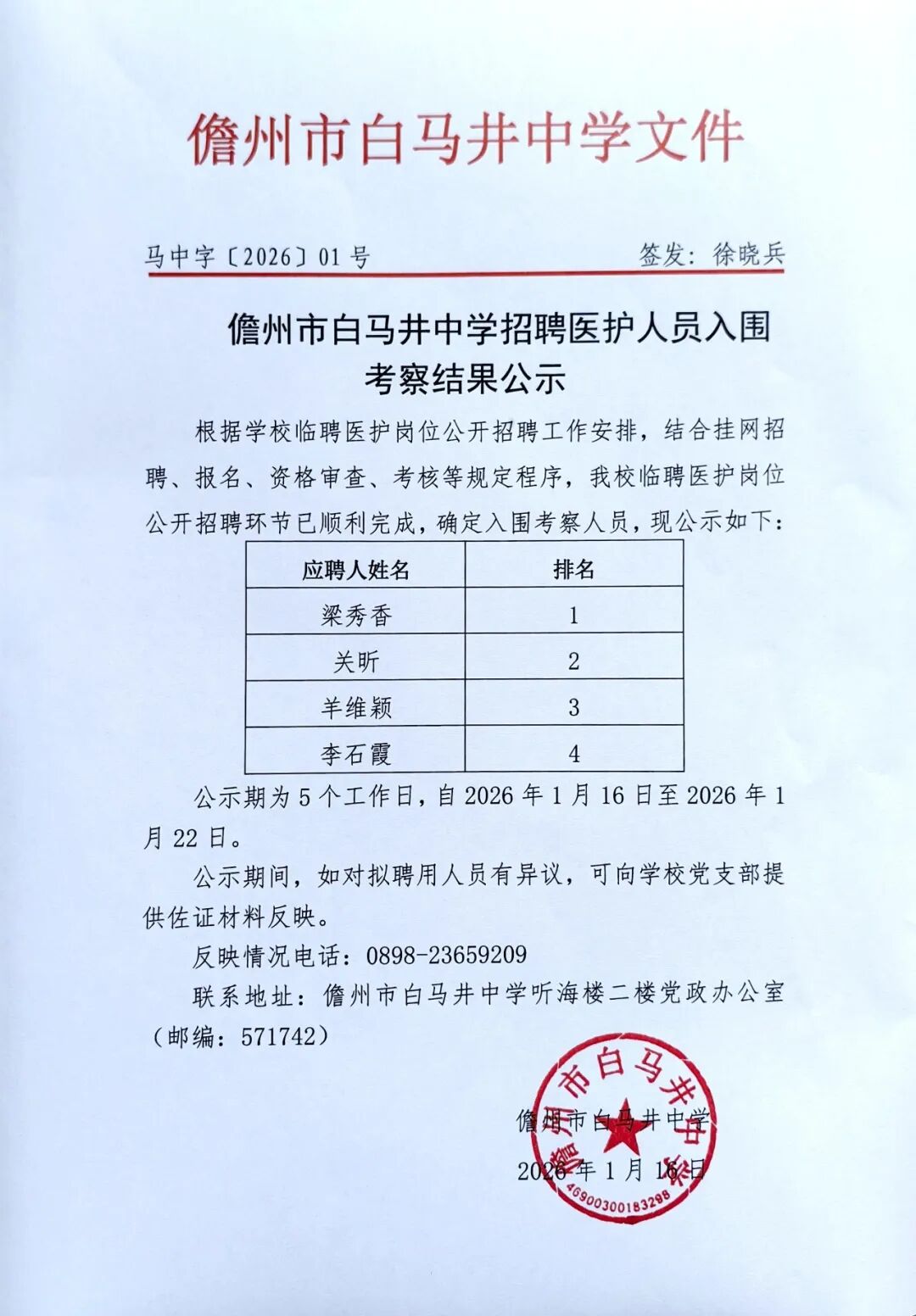 儋州市白马井中学招聘医护人员入围考察结果公示 ...