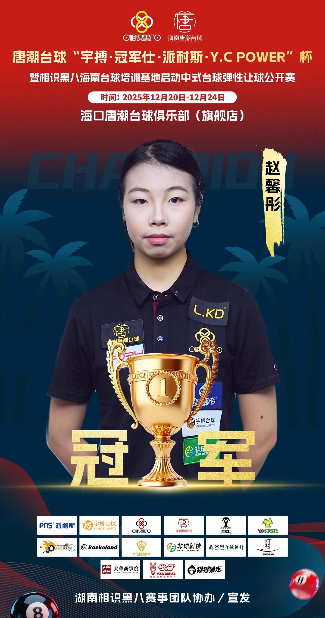 2025年12月20日至24日,海南|海口唐潮台球“宇搏・冠军仕・派耐斯・Y.C POWER”杯中式台球弹性让球公开赛暨相识黑八海南台球培训基地启动活动,在唐潮台球旗舰店璀璨启幕。五天赛程,见证了从激烈角逐到荣耀加冕的全过程;一场盛典,开启了海南台球专业化发展的全新纪元。