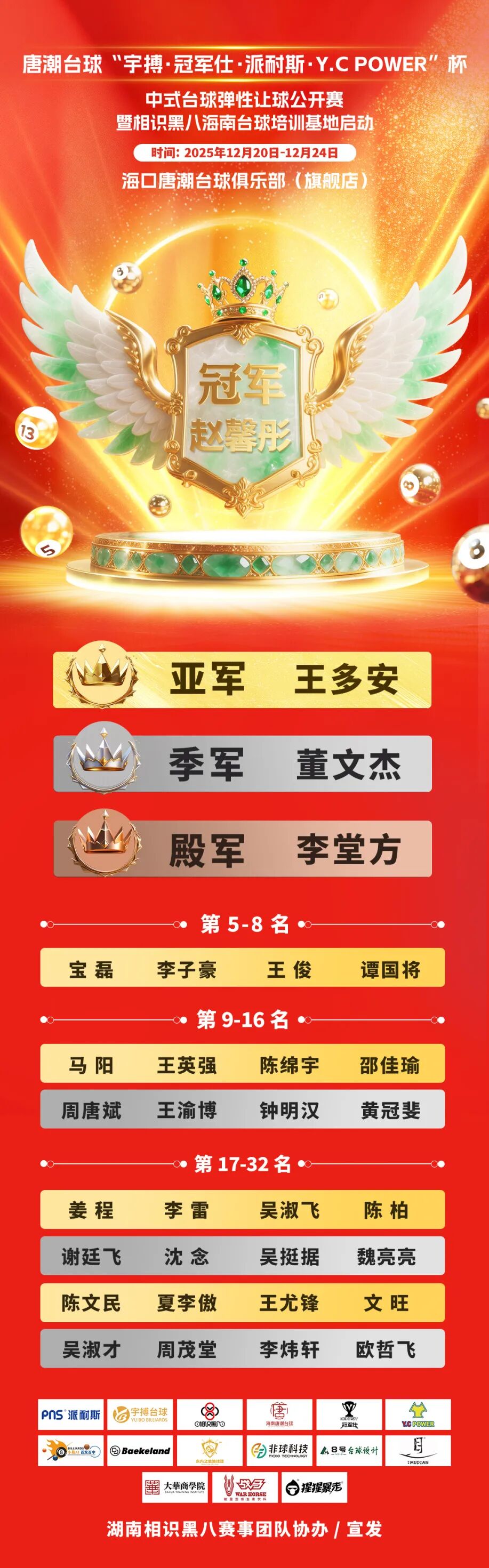 2025“宇搏・冠军仕・派耐斯・Y.C POWER”杯中式台球弹性让球公开赛暨相识黑八海南台球培训基地启动活动圆满收官