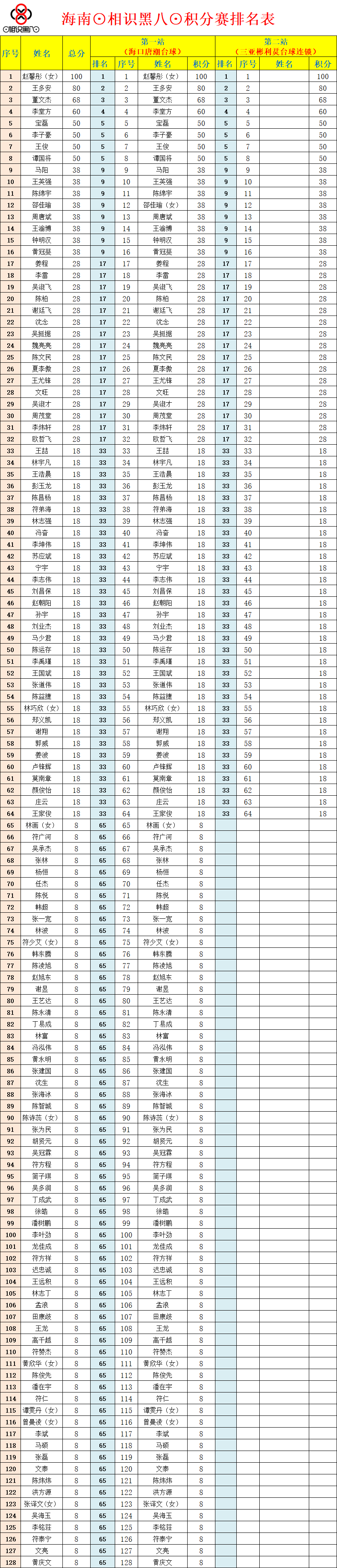 附:《海南相识黑八积分赛排名表》