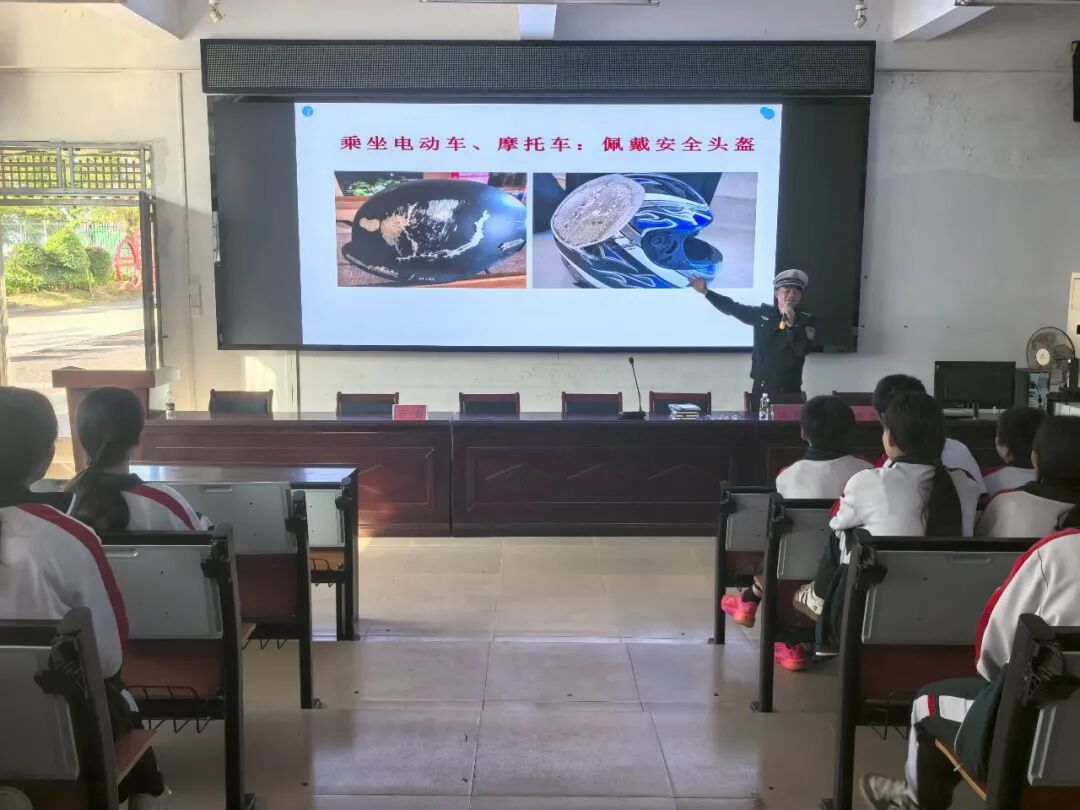 近日,儋州市公安局交通管理支队组织宣讲队伍深入9所学校开展系列普法宣传活动,为孩子们系好寒假出行“安全带”。