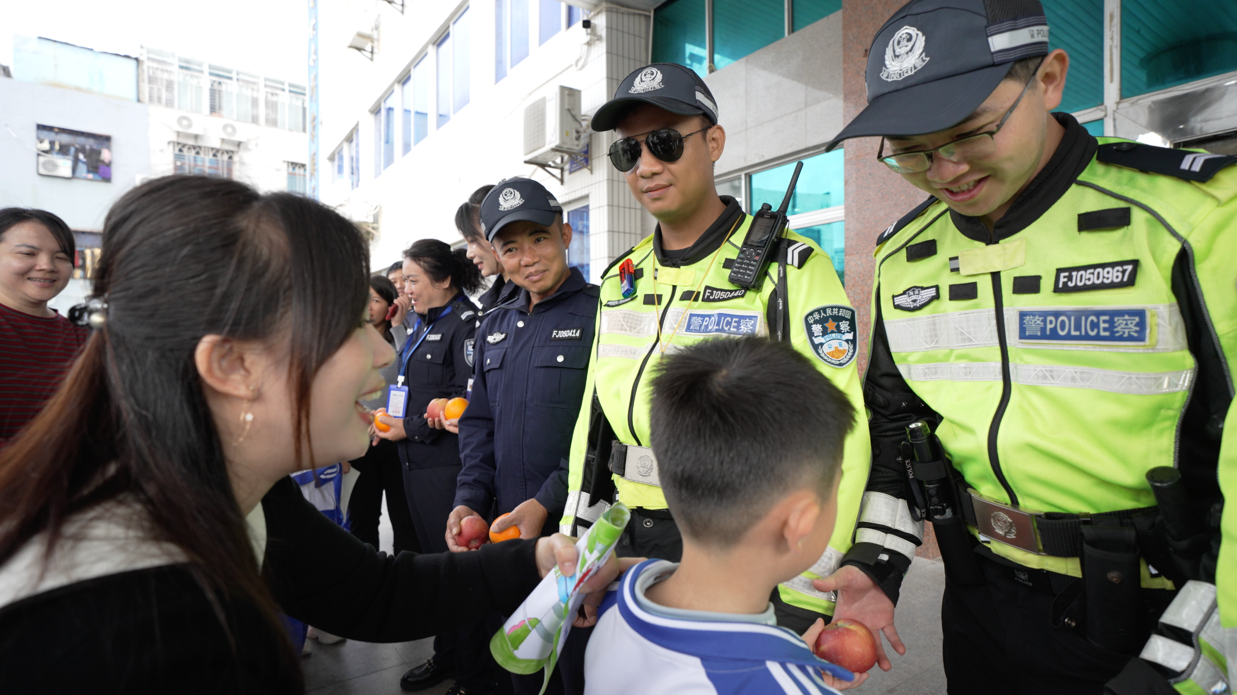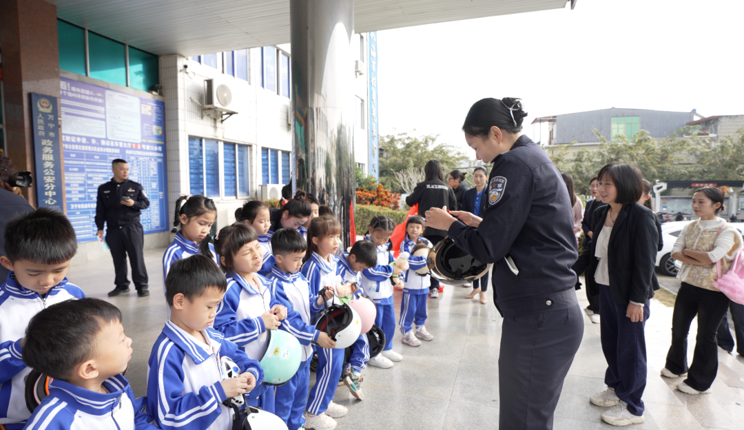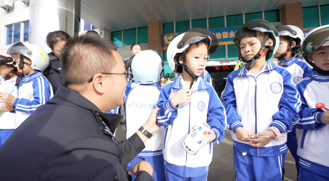 活动中,小朋友带来亲手制作的小礼物和祝福卡片,与交警叔叔阿姨们准备的交警小熊、安全头盔互换。随后交警现场演示安全头盔正确佩戴方法,“帽子要戴正,系带要拉紧,留出两根手指间隙为宜,听到‘咔哒’一声才算好”,小朋友们拿起头盔认真学习,从调整头围到系紧卡扣,每个步骤都一丝不苟。