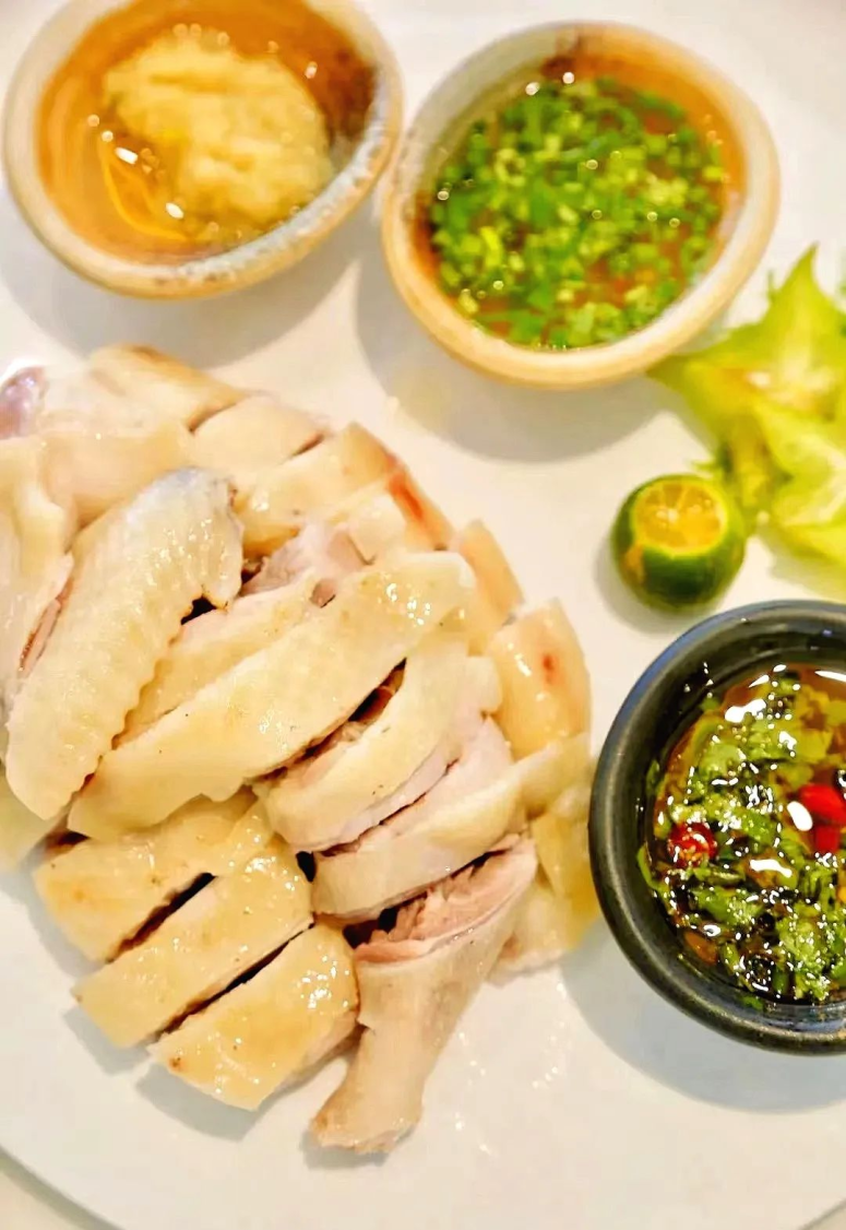 现开的椰青水汩汩倒入锅中,清甜果香扑面而来,下入皮薄肉嫩的海南文昌鸡,小火慢煮至汤色乳白。先舀一勺原汤,椰香清润回甘,暖心又暖胃,再夹起一块鸡肉,蘸上沙姜、小金桔、生抽调制的秘制蘸料,酸辣提鲜,口感层次瞬间拉满。