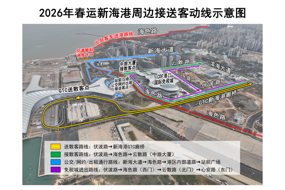 春运期间新海港、秀英港周边路段将依法适时实施临时交通管制,严禁违停滞留、堵路插队。千万不要疲劳驾驶、分心驾驶、超速行驶等,杜绝酒驾醉驾。