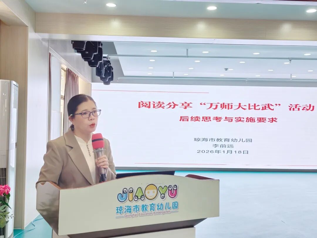 为进一步贯彻落实《3—6岁儿童学习与发展指南》精神,营造浓郁的书香校园氛围,提升教师创设阅读环境、组织阅读分享及指导能力,深入探寻阅读分享活动的组织技巧与思路,积累更为多元的实践经验,从而有效助推幼儿园阅读活动的质量,2026年1月18日上午,琼海市教育幼儿园教育集团组织全体教师开展了以阅读分享活动为核心的教师寒假培训活动。