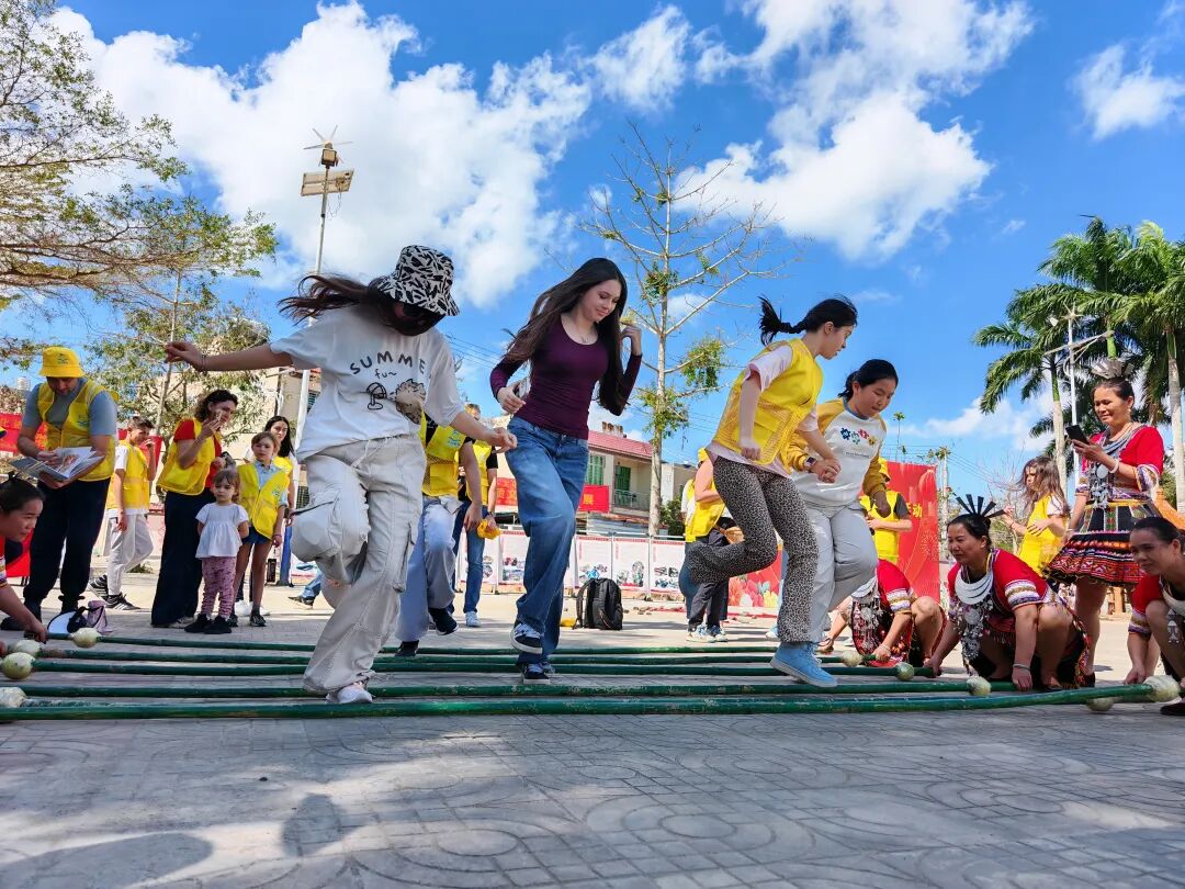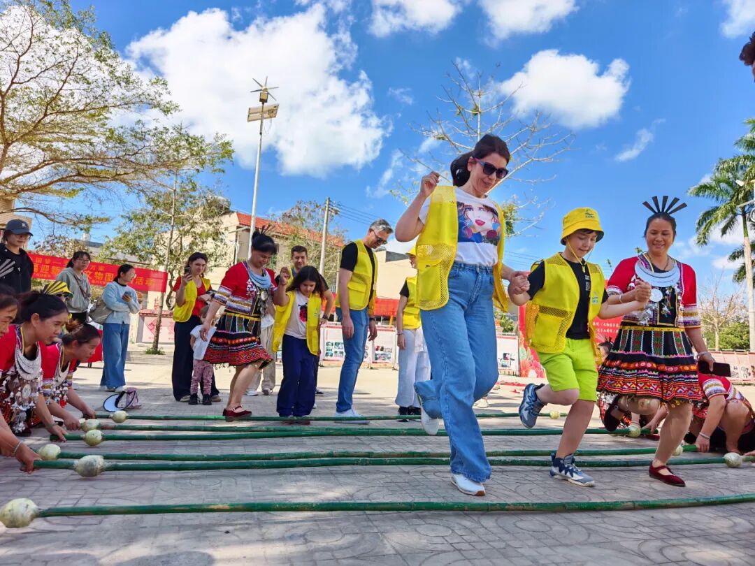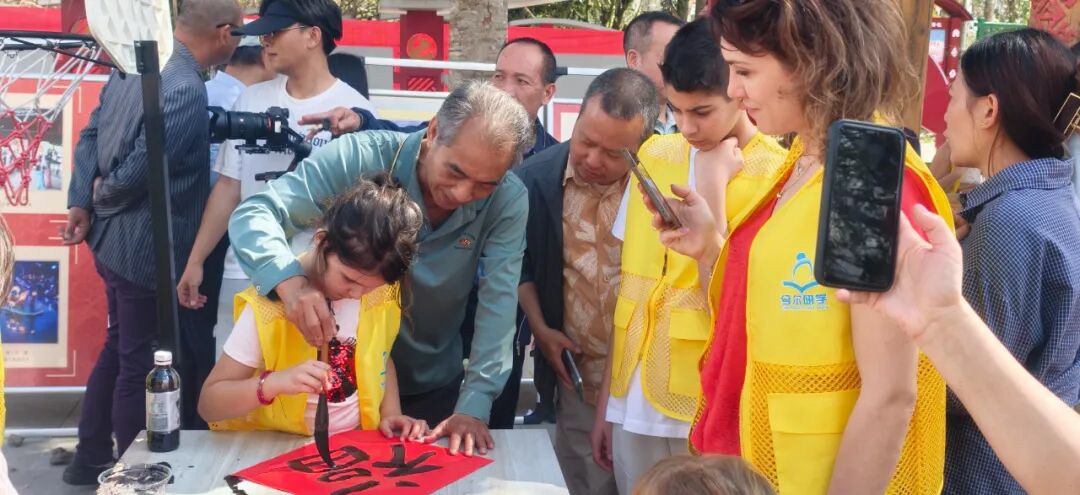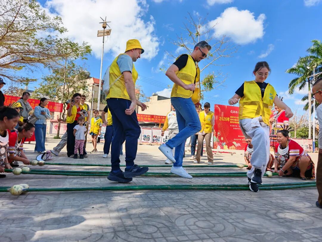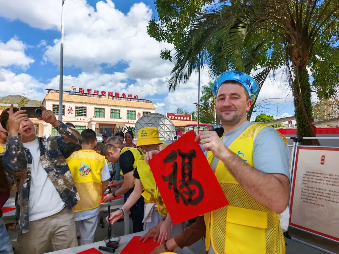 在欢快的节奏中,大家手拉手跳起竹竿舞,在竹竿分合的间隙灵活穿梭,欢声笑语不断;在写春联的摊位前,游客们拿起毛笔,在红纸上认真临摹福字与春联,感受汉字的独特魅力与新春的美好寓意。从灵动的民族舞蹈到笔墨飘香的传统习俗,外国友人在互动中真切领略中华文化的深厚底蕴,也让这场跨国文化交流充满温情与活力。