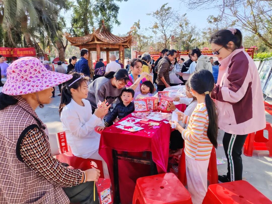 活动现场热闹非凡,洋溢着喜庆祥和的节日氛围。村民或驻足翻阅图书,沉浸在知识海洋中;或有序排队领取春联,脸上满是期待;或专注体验手工制作,感受传统民俗乐趣;或踊跃参与诗词互动,在诵读中传承文化。