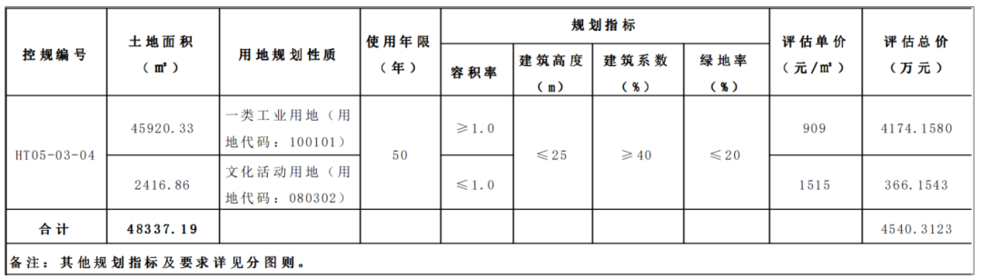根据有资质的土地评估中介机构评估,并经评估专家小组评审通过,该宗地土地评估总价为4540.3123万元。具体情况为:1.工业用地土地评估单价为909元/㎡(折合60.6万元/亩),土地评估总价为4174.1580万元。2.文化活动用地土地评估单价为1515元/㎡(折合101万元/亩),土地评估总价为366.1543万元。