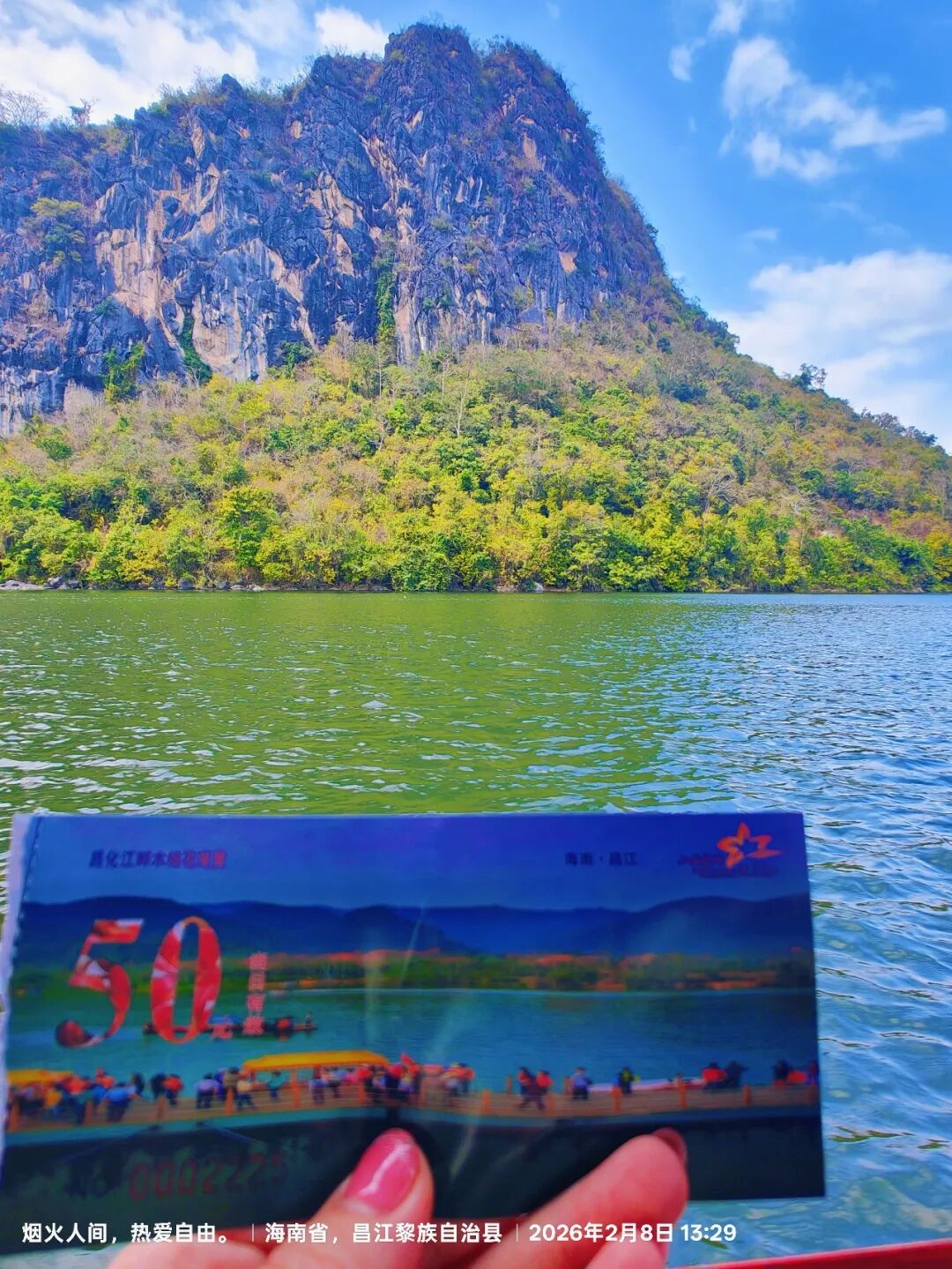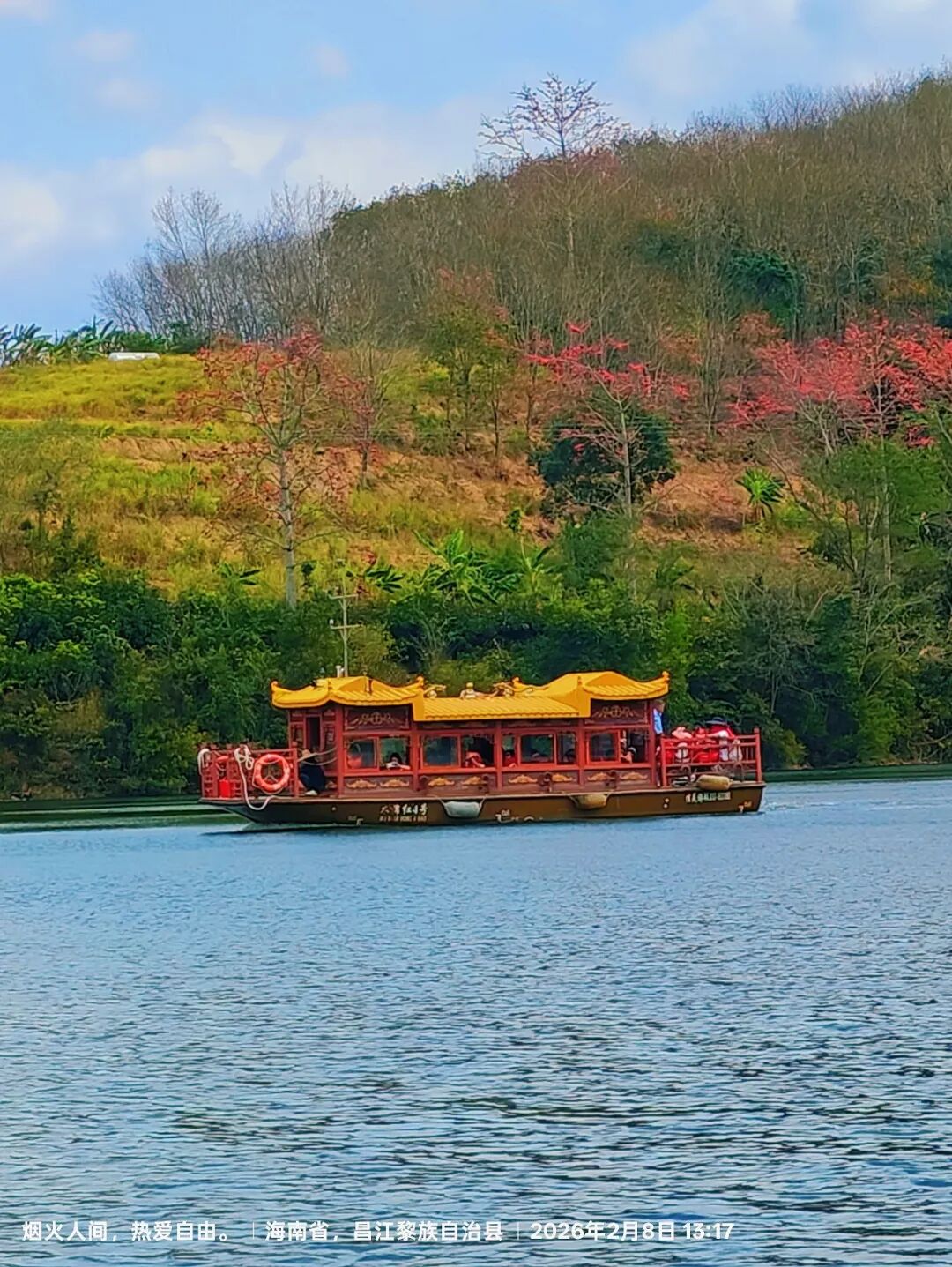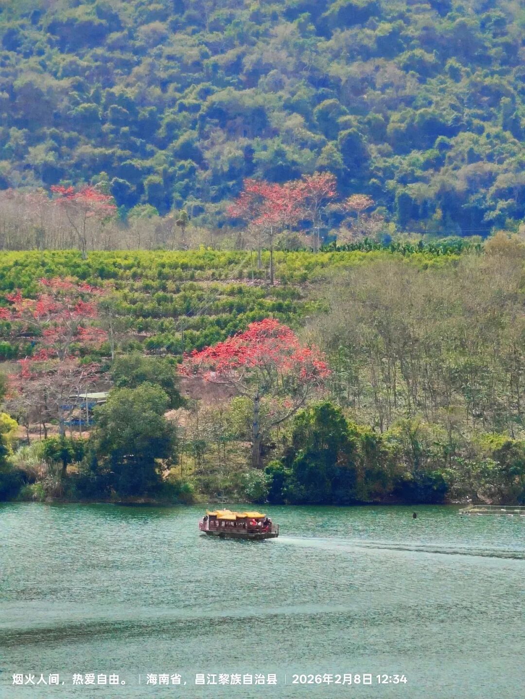 这一次是专程去昌化江畔木棉赏花码头坐船观赏木棉花(自驾导航到木棉花赏花码头就行,里面设有停车场,停车场不大,旺季的时候很多车都停靠路边,再走下去码头),到码头坐船需要排队买船票,船票是50元每人,人数满一船就开一趟,在昌化江畔坐船游玩还可远望东方的俄贤岭(海南小桂林所在地)。