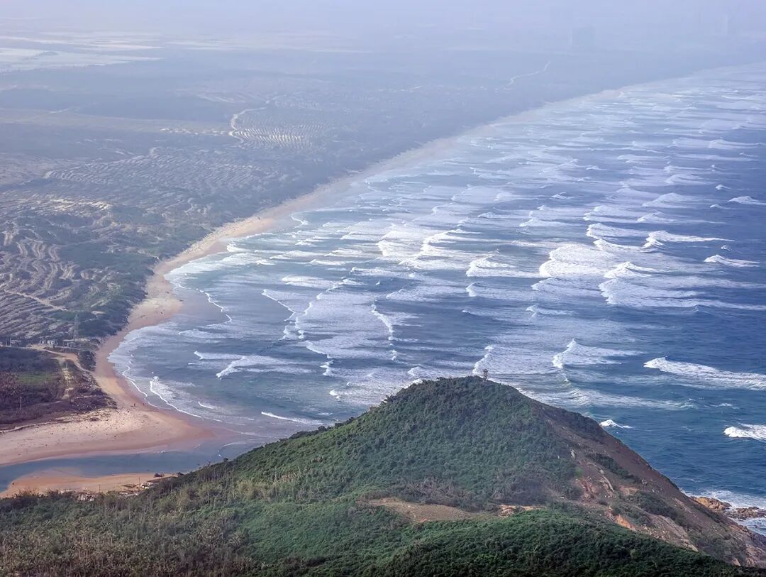 凡是登上过铜鼓岭的人,一定对山下那海浪层层叠叠的月亮湾留下过深刻印象。在长达11公里的海湾里,那海湾如同一幅镶着银线的碧锦,银花耀眼,风光旖旎。我曾在铜鼓岭上目睹过它的风采,真被眼前的风光震撼到了,世间还有如此美妙的景色。