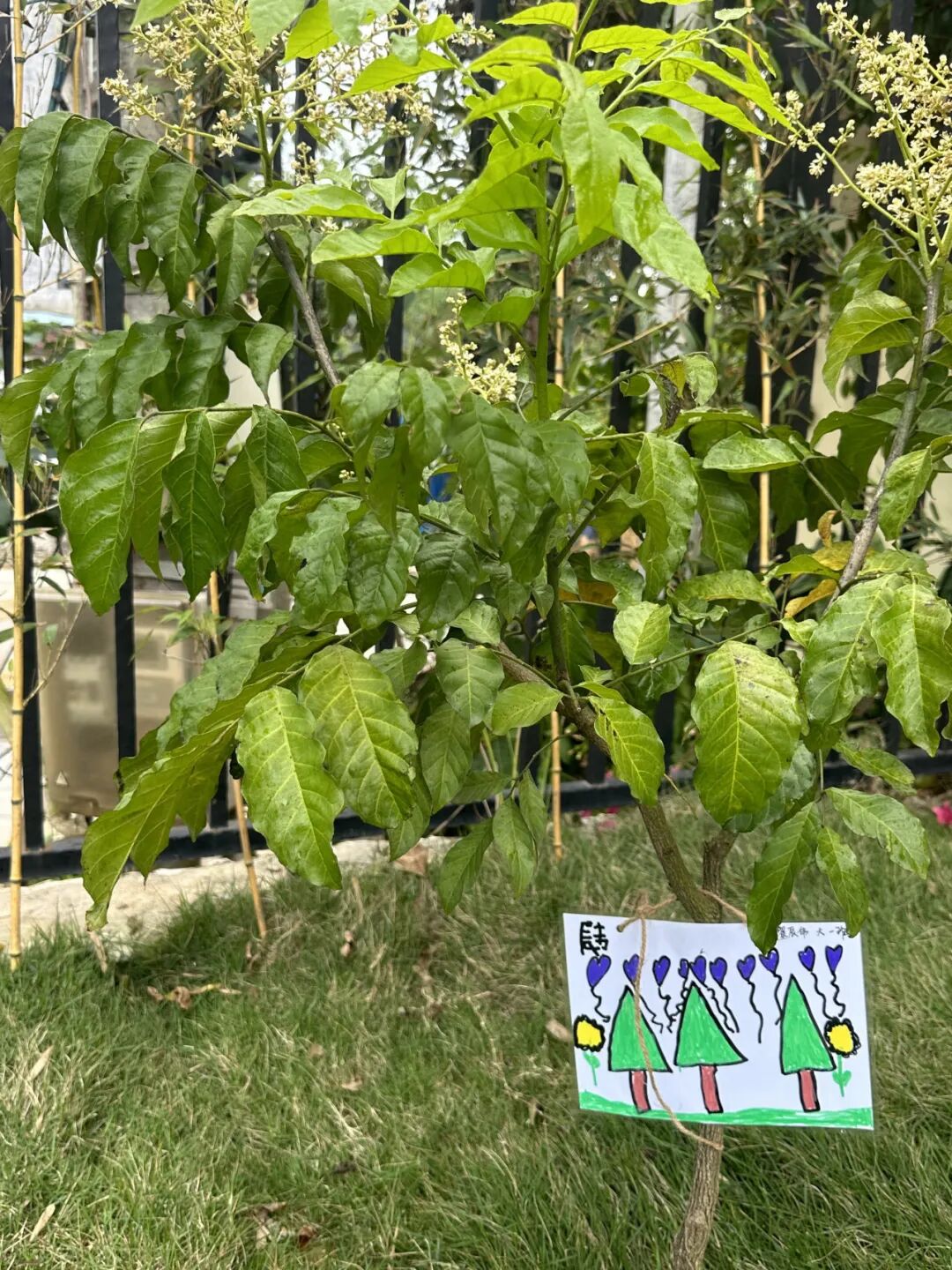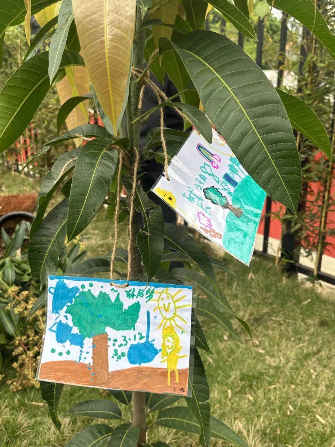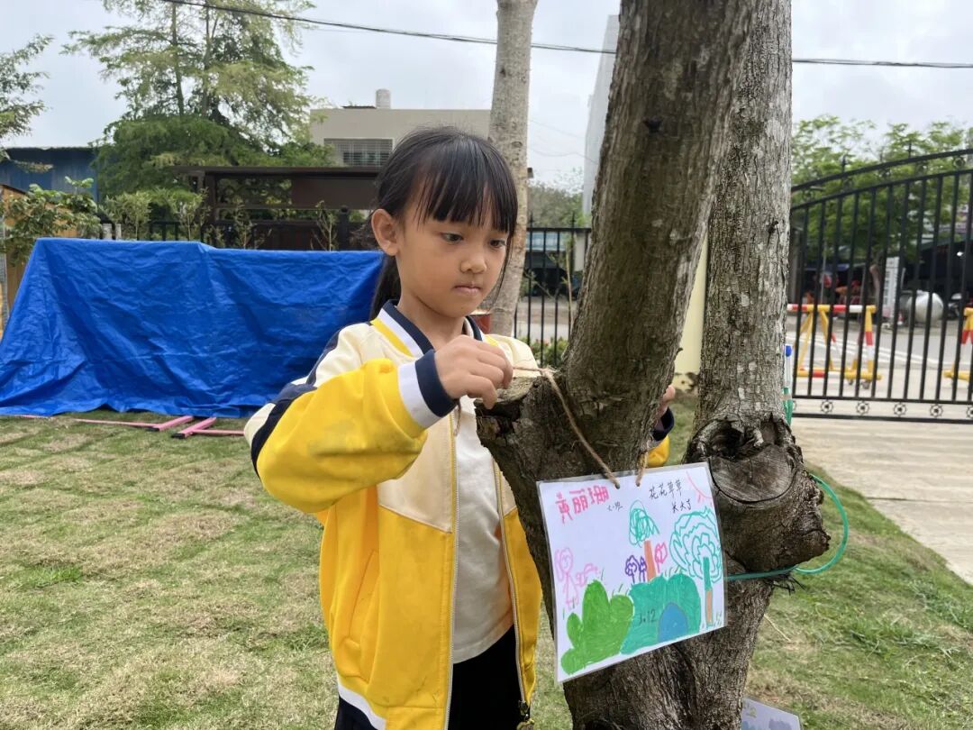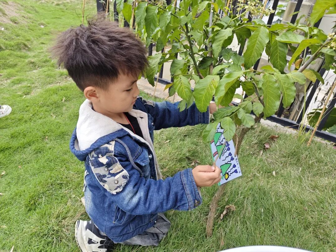 大班的孩子们还亲手制作了护绿小牌,写下温馨的护绿标语,小心翼翼的挂在树枝上,绿植旁,许下守护绿色、爱护自然的约定。