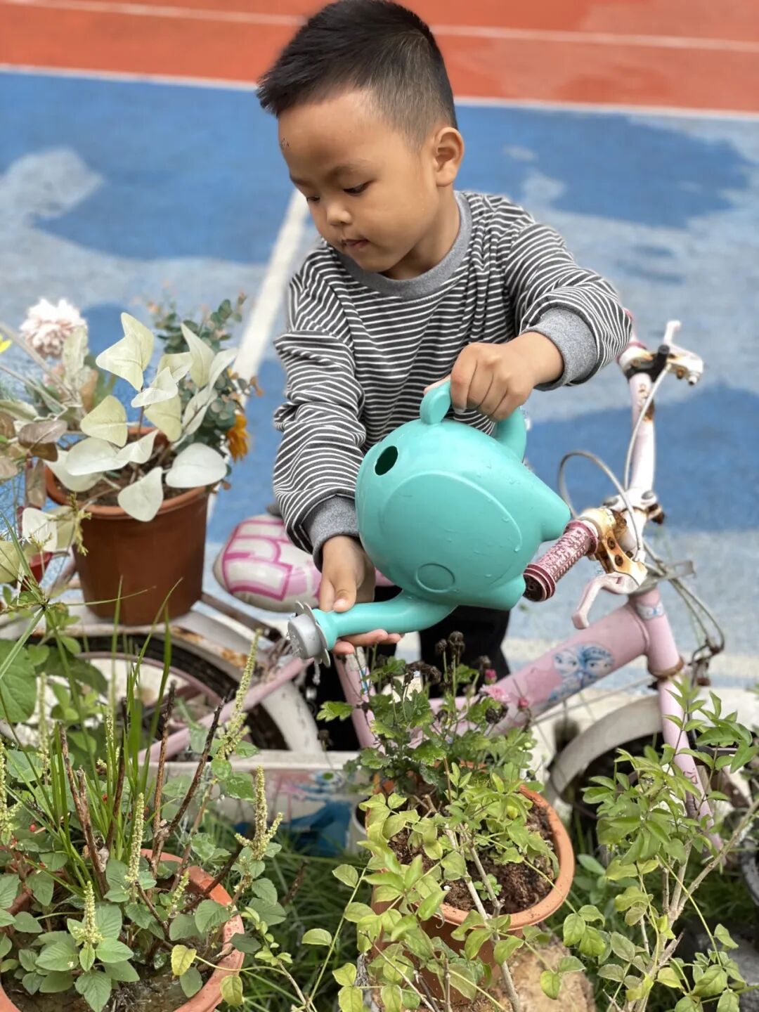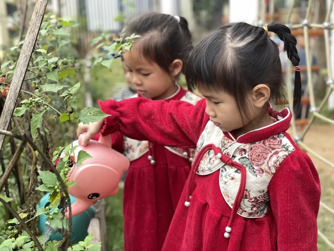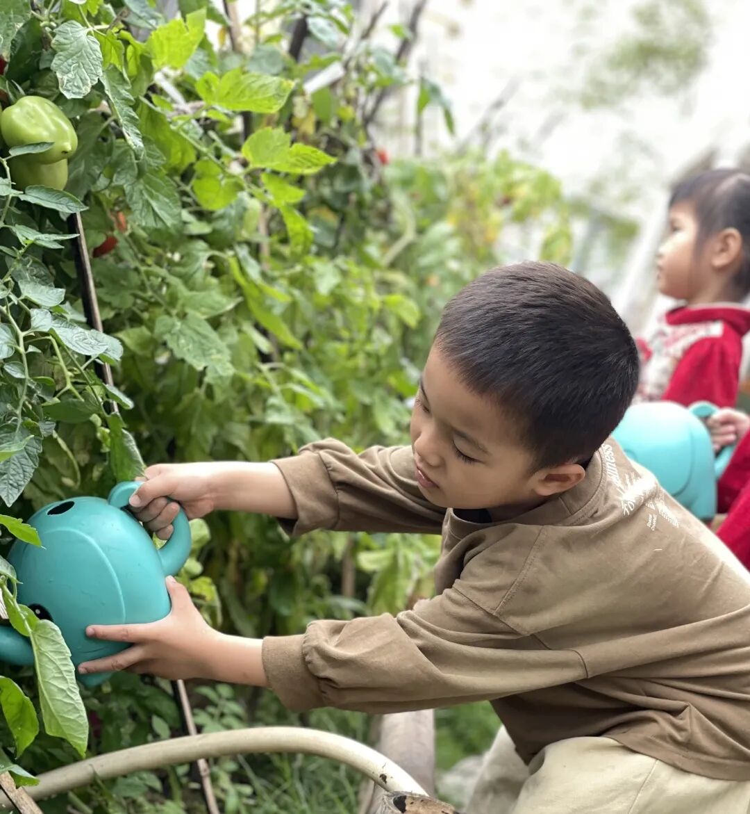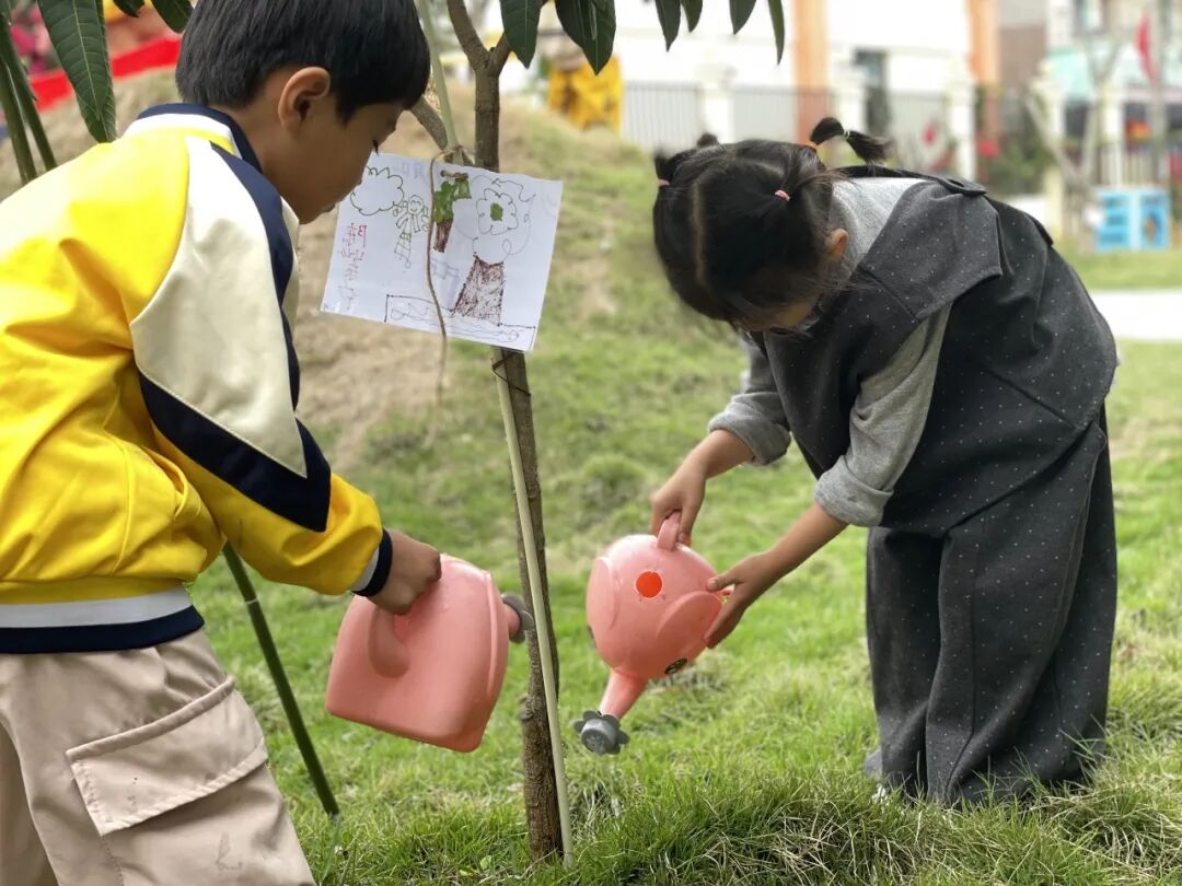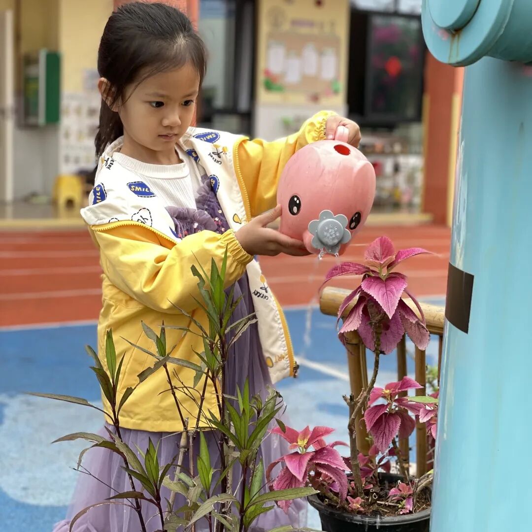 爱护自然,始于行动。孩子们提着小水壶,为幼儿园的大树、花草、蔬菜细心浇灌,每一滴水都承载着对自然的呵护。