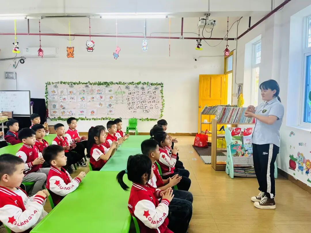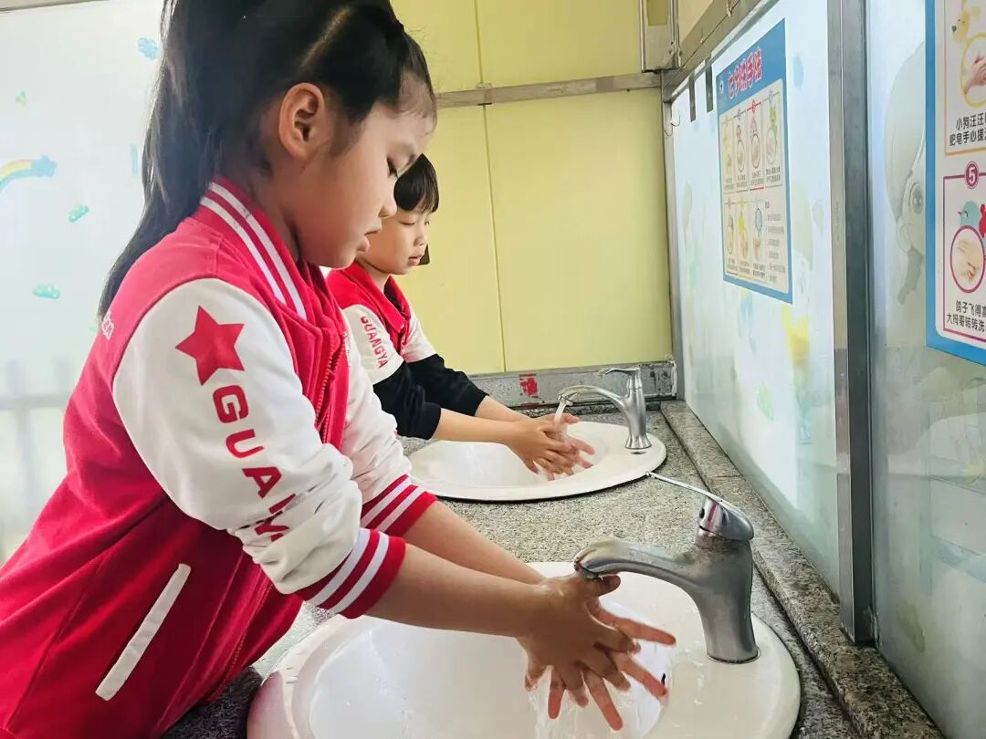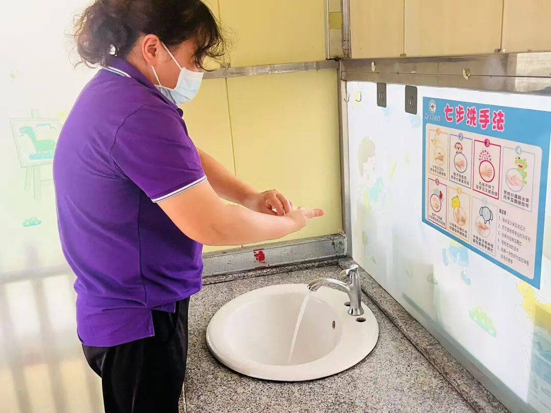 教师引导幼儿用“七步洗手法”进行手部清洗。