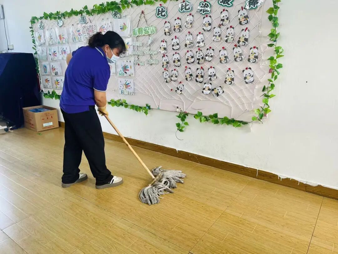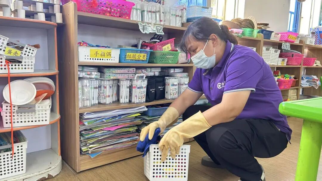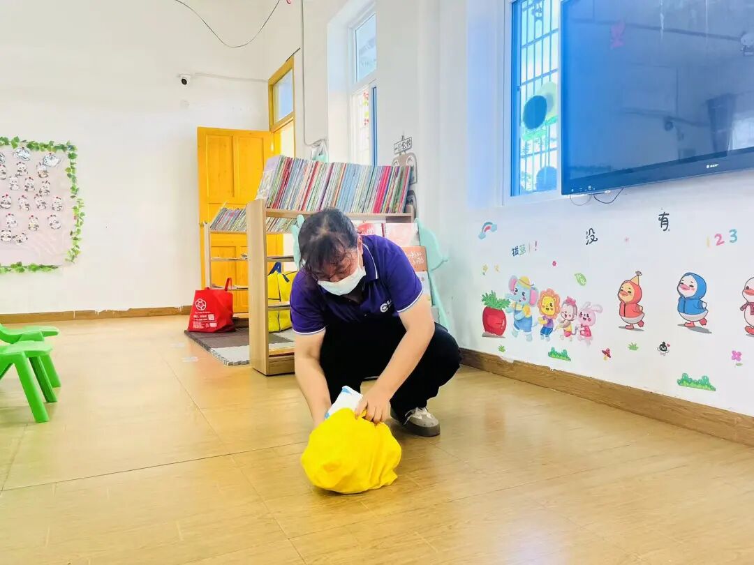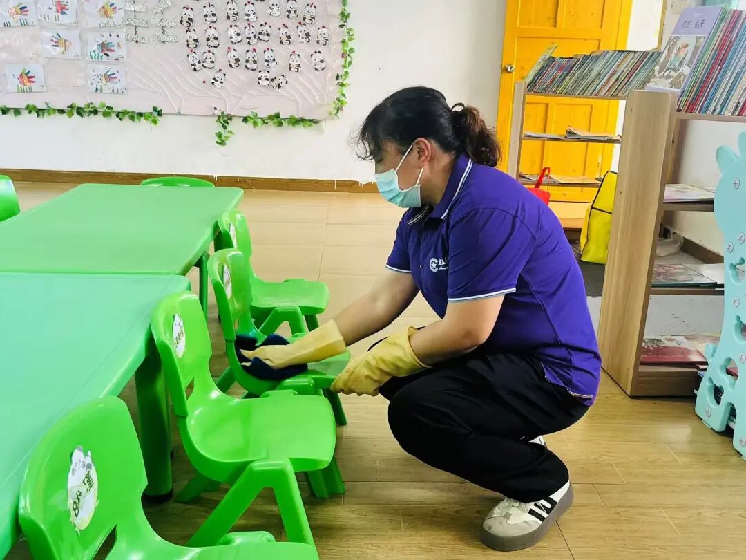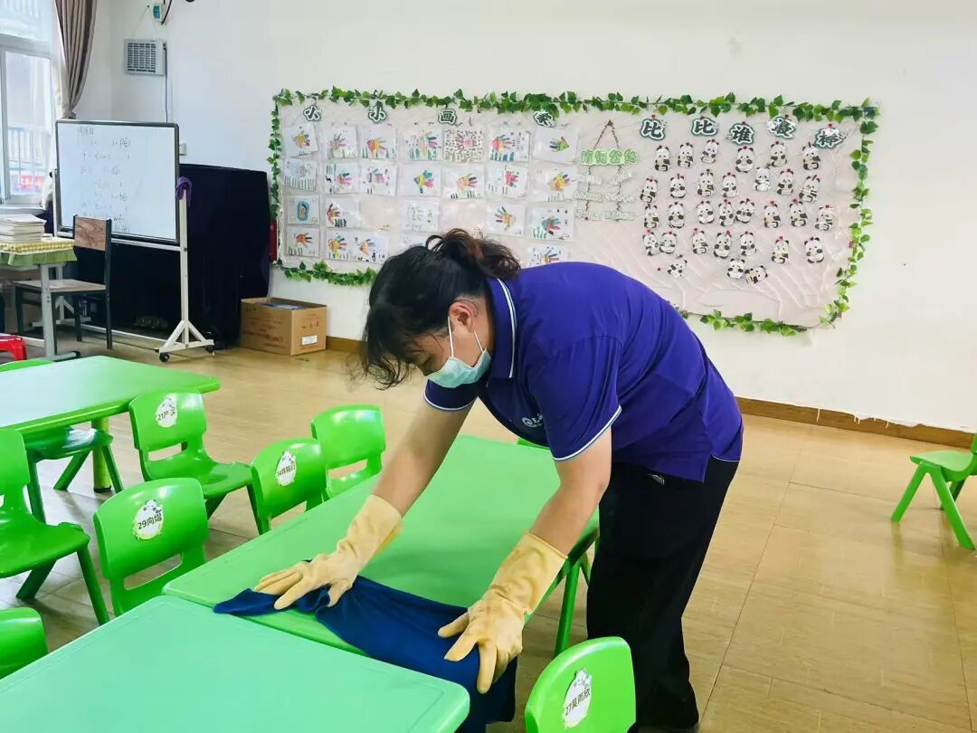 保育老师对教室地面消毒,桌椅、门窗、玩具等进行消毒。