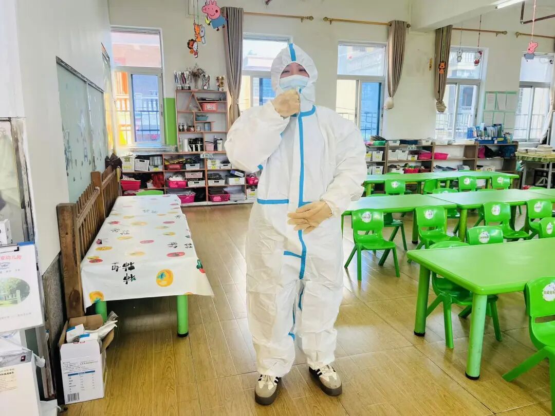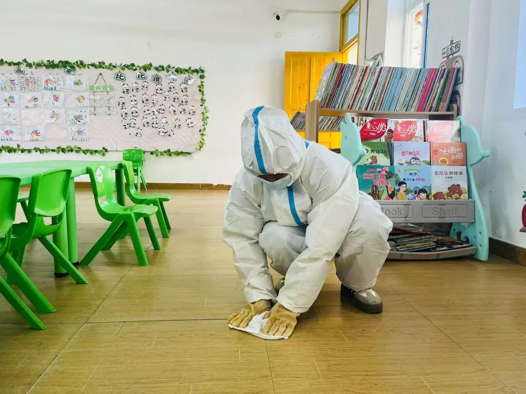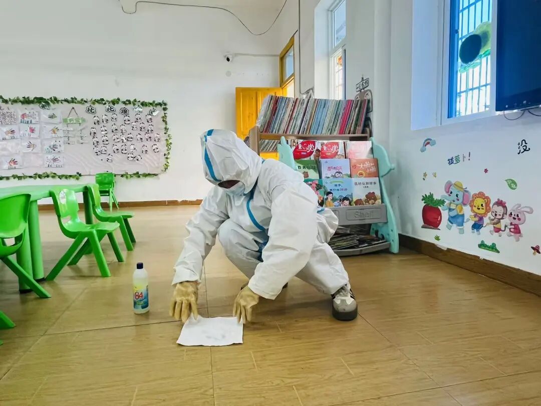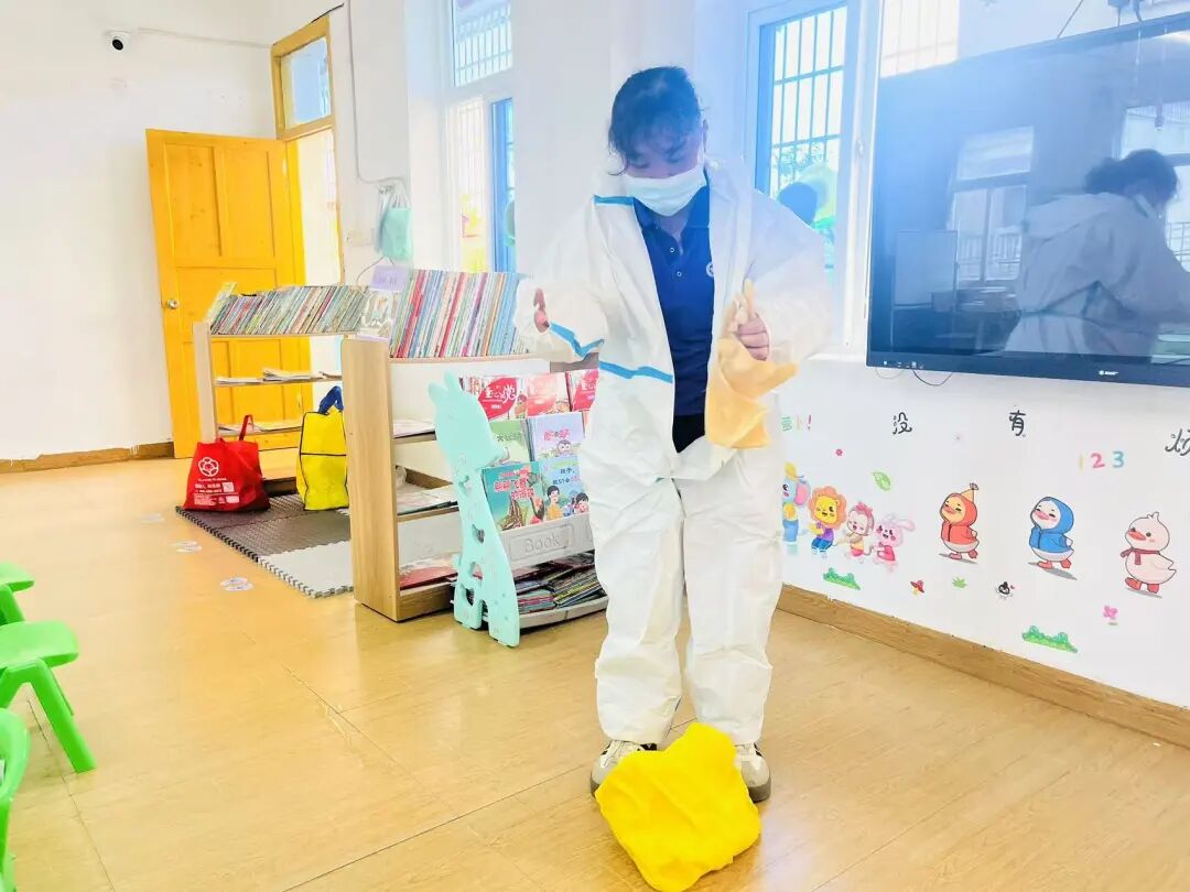 保育老师做好个人防护后,先将呕吐物清理干净,静置30分钟,螺旋式重复消毒。
