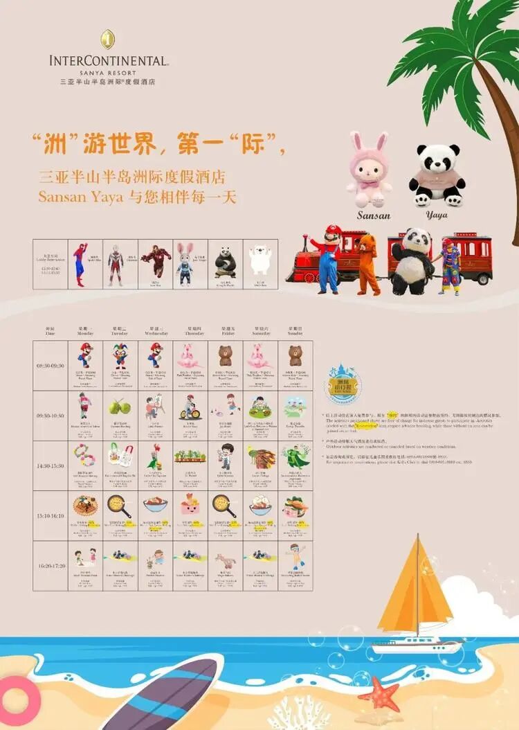 2.每日活动仅供参考,酒店根据季节可能会有调整,具体活动内容以酒店当天发布为准。